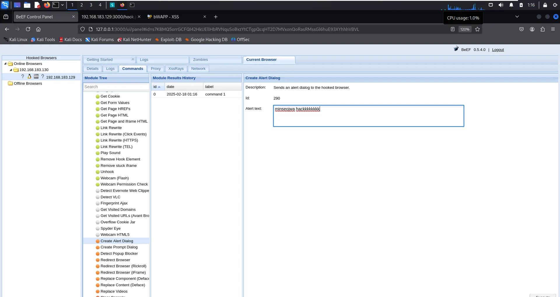 BeEF 패널에서 Commands>Create Alert Dialog 선택 후 원하는 메시지를 입력하고 실행시키면