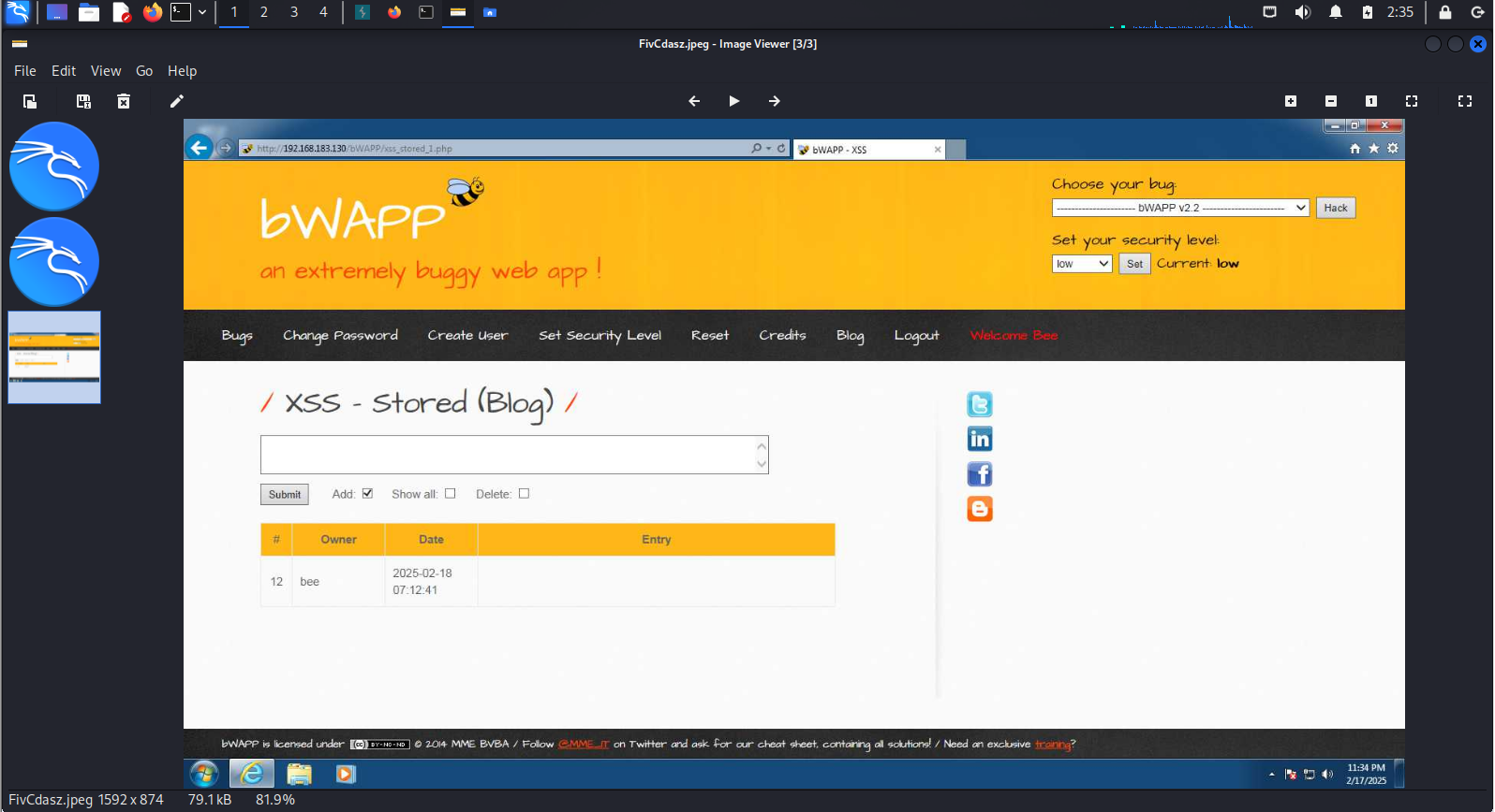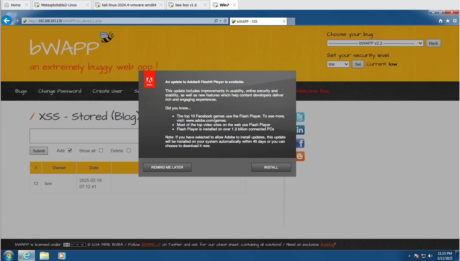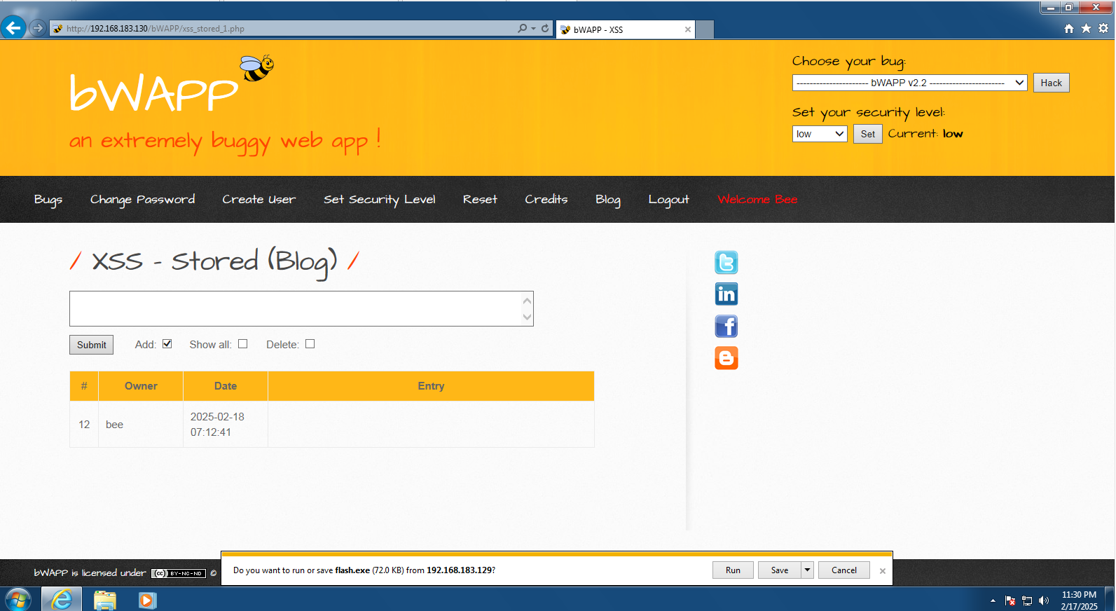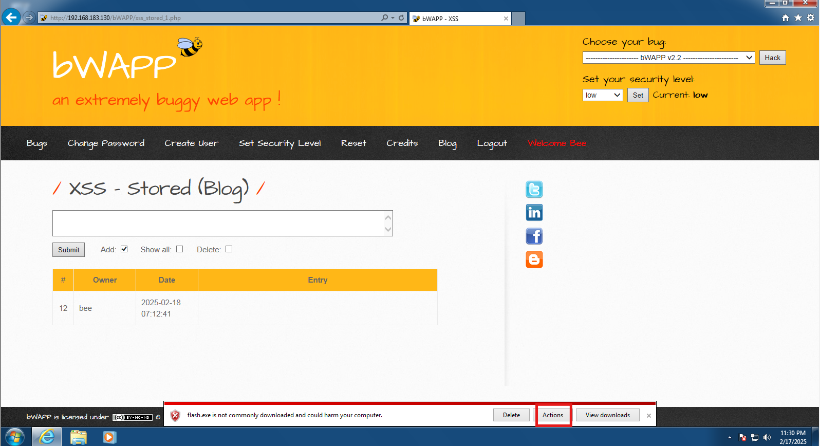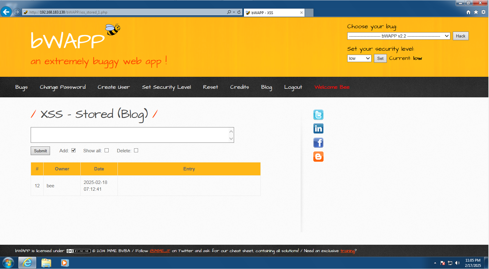이 실습은 Stored XSS 취약점이 존재하는 게시판(bWAPP/XSS-Stored(Blog))을 BeEF와 함께 활용하는 환경을 가정한다.