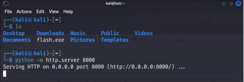 BeEF(브라우저 익스플로잇 프레임워크)를 사용해 flash.exe 파일의 URL을 Adobe Flash Player 업데이트로 위장하여 공격할 수 있다. 공격 시나리오는 아래와 같이 진행한다.
