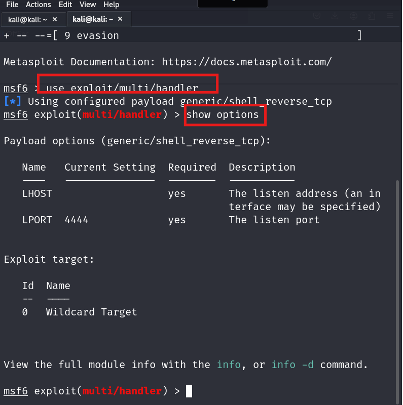 마찬가지로 페이로드도 설정한다. 설정이 완료되었으면 exploit 명령어를 입력하여 대기 상태로 만든다.
