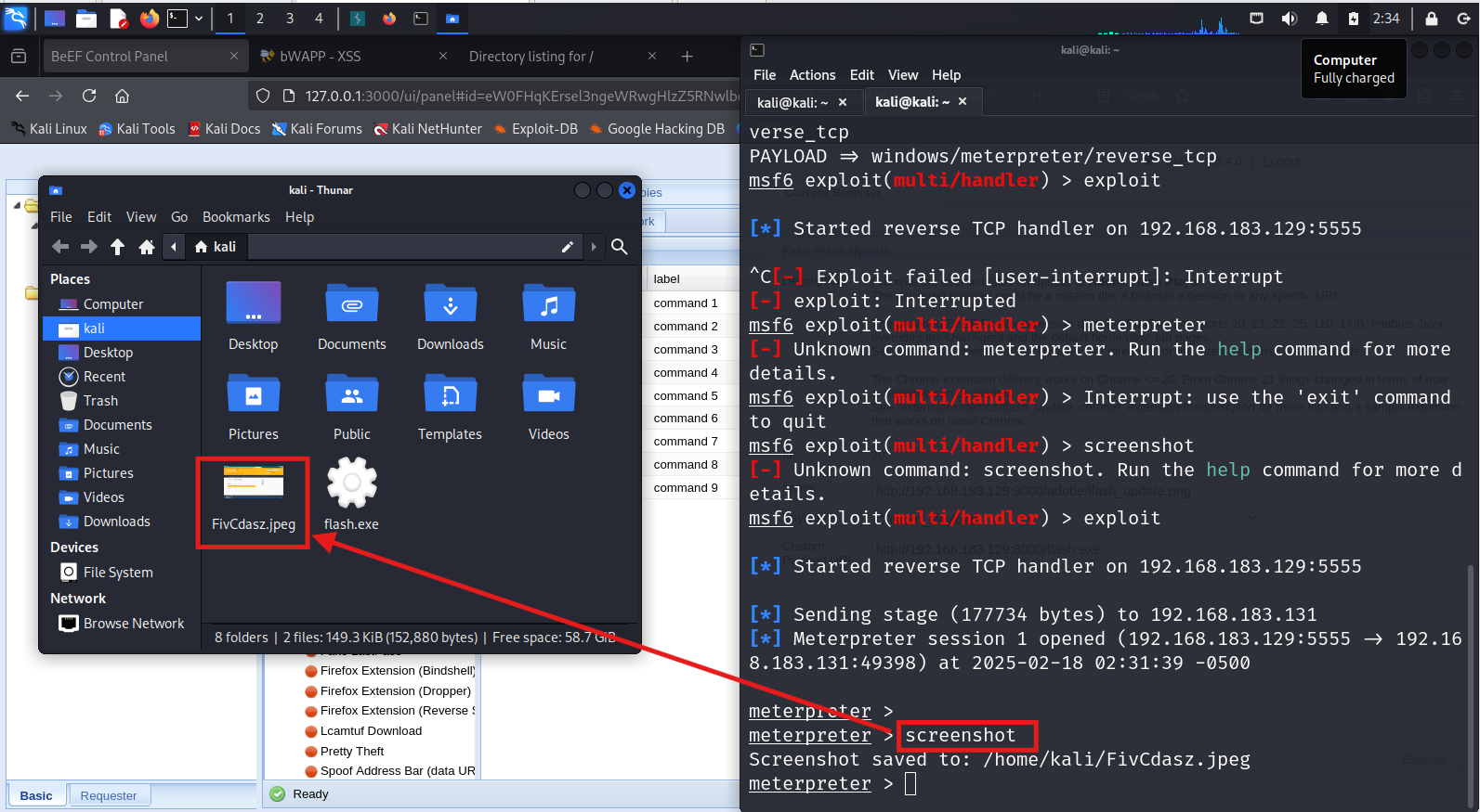 예를 들어, screenshot 명령어를 입력하면 클라이언트 화면 스크린샷이 칼리 리눅스에 저장된다.