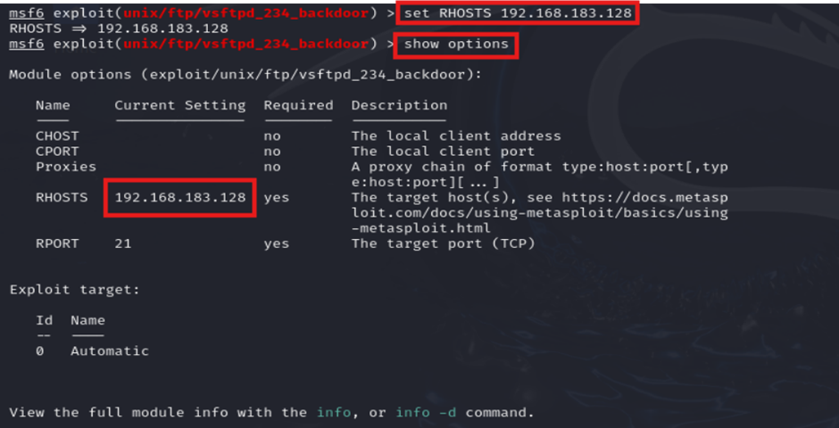 타겟의 호스트 주소(192.168.183.128)를 설정하고, 다시 설정된 옵션을 확인한 결과 타겟의 주소가 설정된 것을 확인했다.