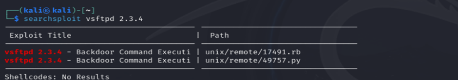 Exploit-DB에서 해당 버전의 취약점을 검색한 결과, vsftpd 2.3.4 취약점 관련 두 개의 익스플로잇 코드가 검색됐다.