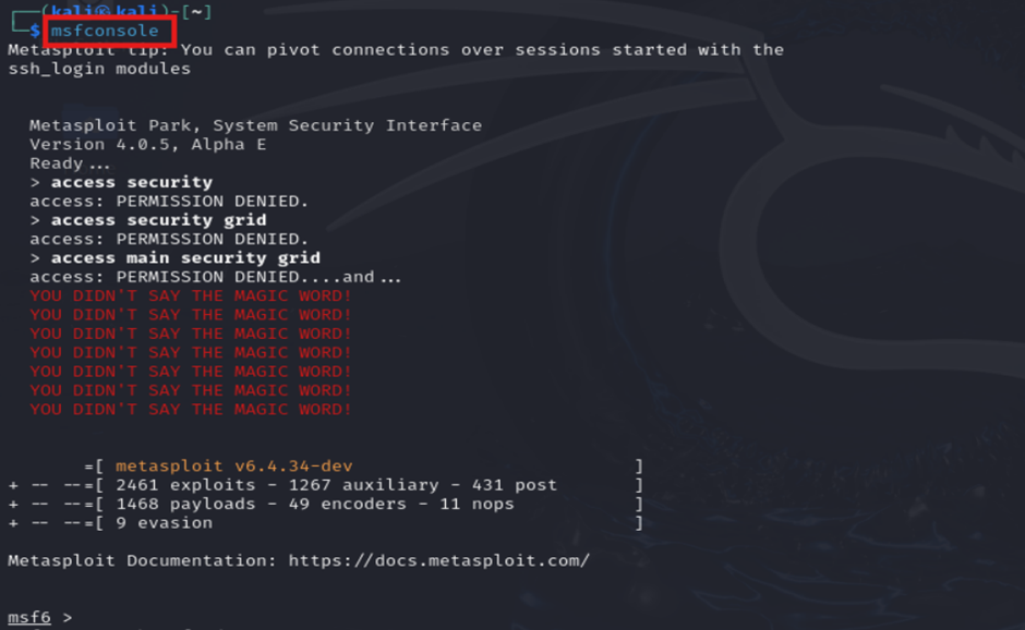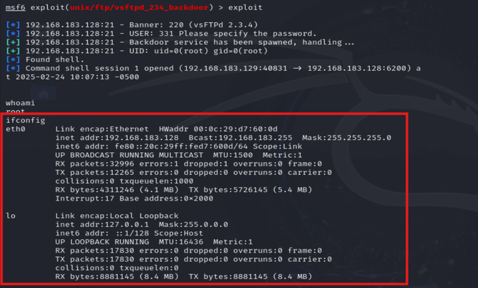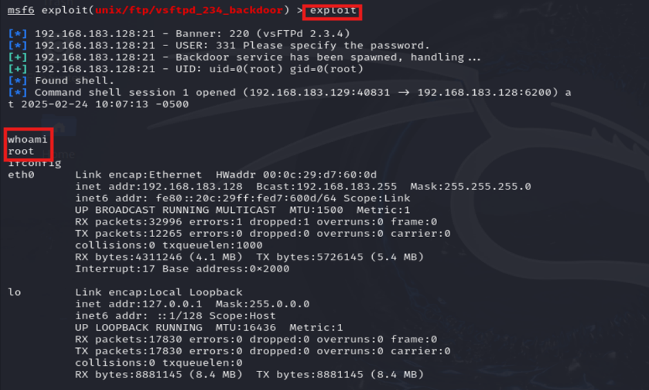 exploit 명령어로 공격을 실행했다. 실행 결과 공격이 성공했고 셸에 접속이 됐다. 현재 셸의 권한을 확인하기 위해 whoami 명령어를 실행했고, root 권한인 것을 확인했다.