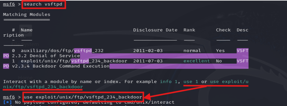 실행 후, vsftpd 취약점 모듈을 검색하고 공격 모듈을 선택한다.