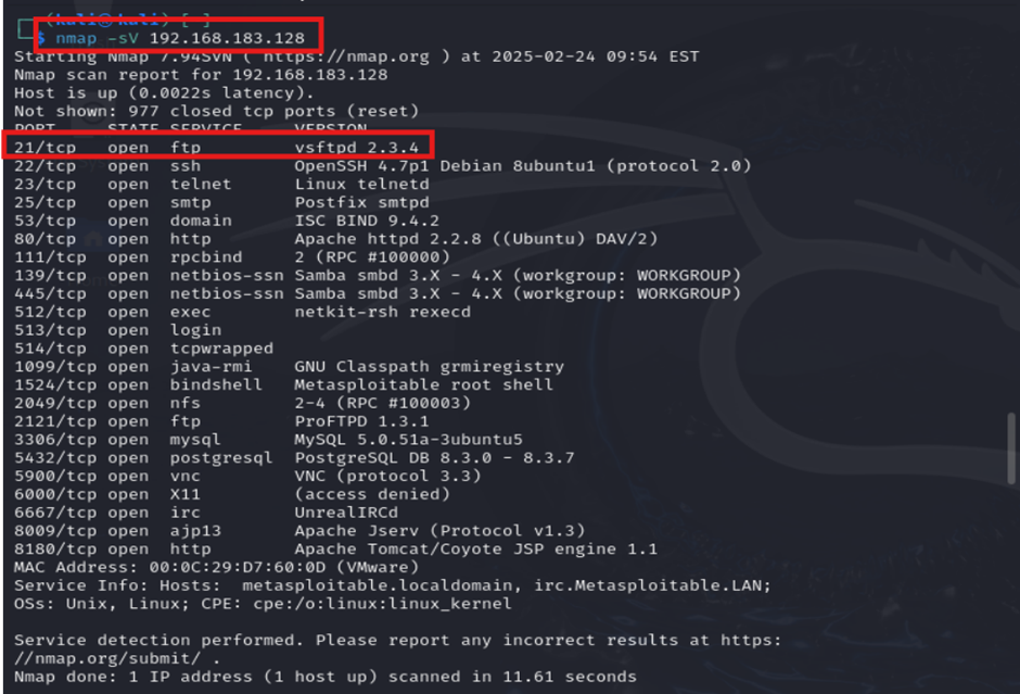 1. Metasploitable 서버 포트 스캔 및 vsftp 버전 정보 확인