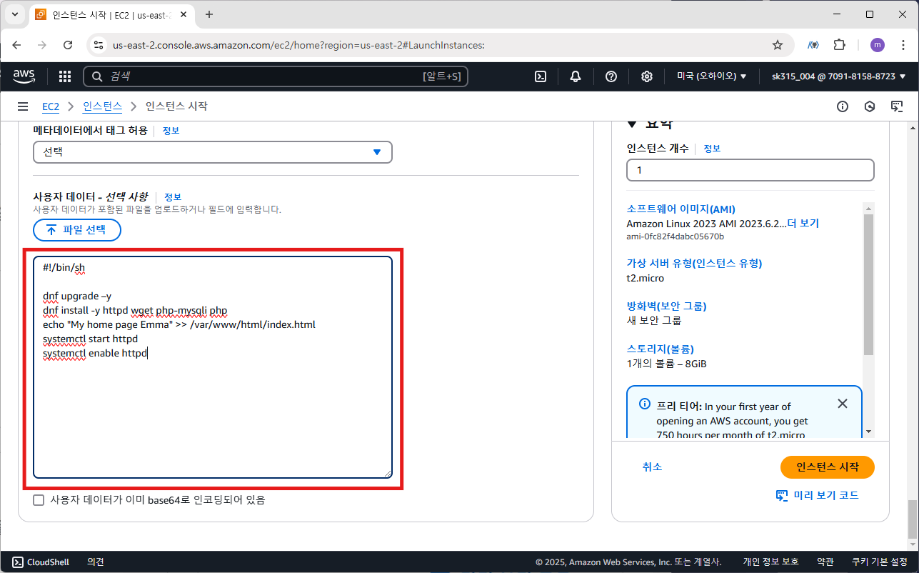 고급 세부 정보 > 사용자 데이터에 다음 스크립트를 입력하여 웹서버 자동 설정:
