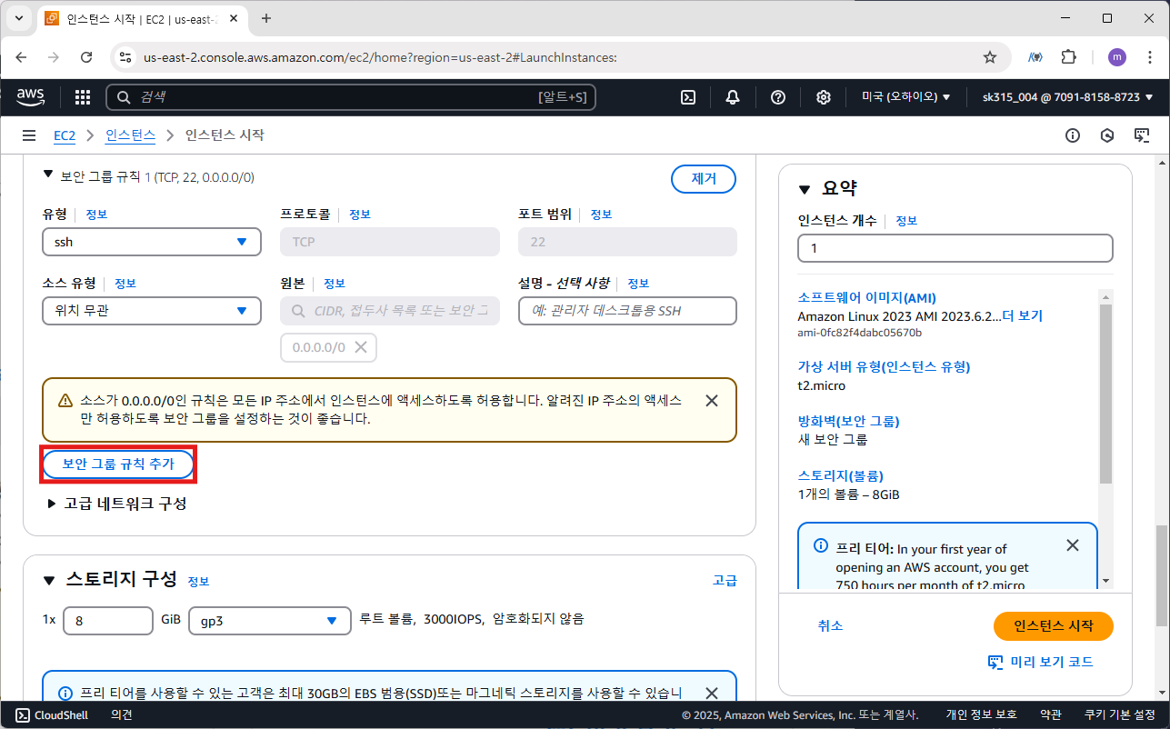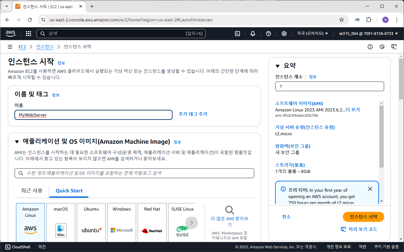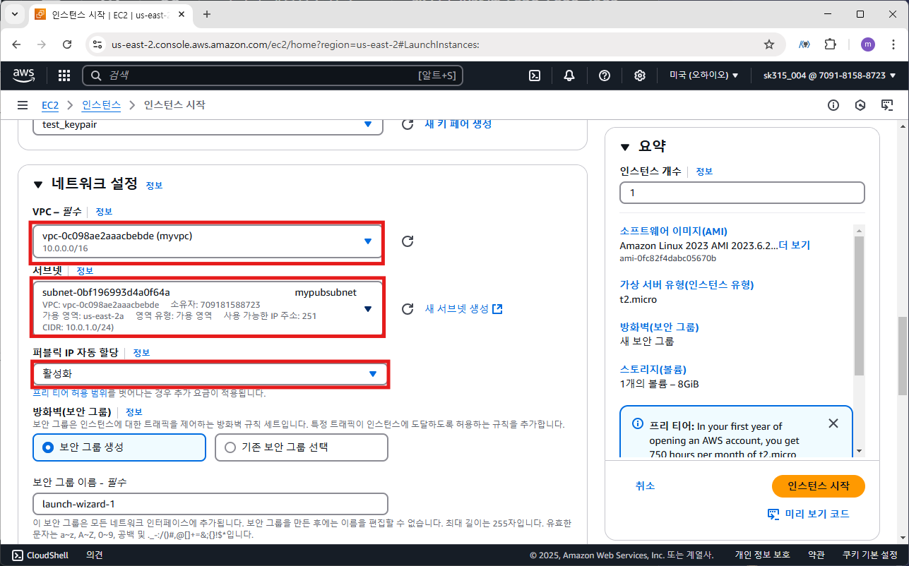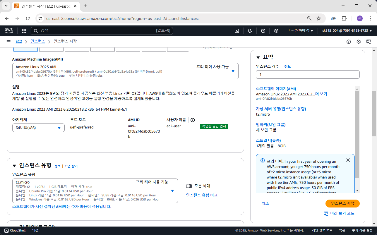 AMI는 amazon linux 2023 AMI, 인스턴스 유형은 t2.micro