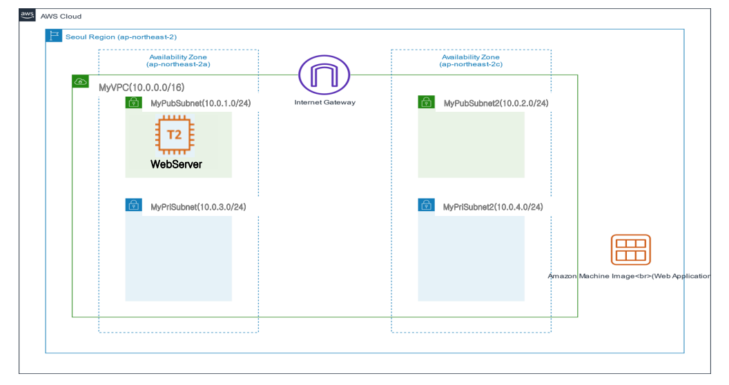 이번 웹서버 인스턴스 생성 및 연결을 위한 목표 아키텍처는 위와 같다. 이전에 구성했던 myvpc의 퍼블릭 서브넷에 웹서버 인스턴스를 생성하고 연결하는 것을 진행할 것이다.