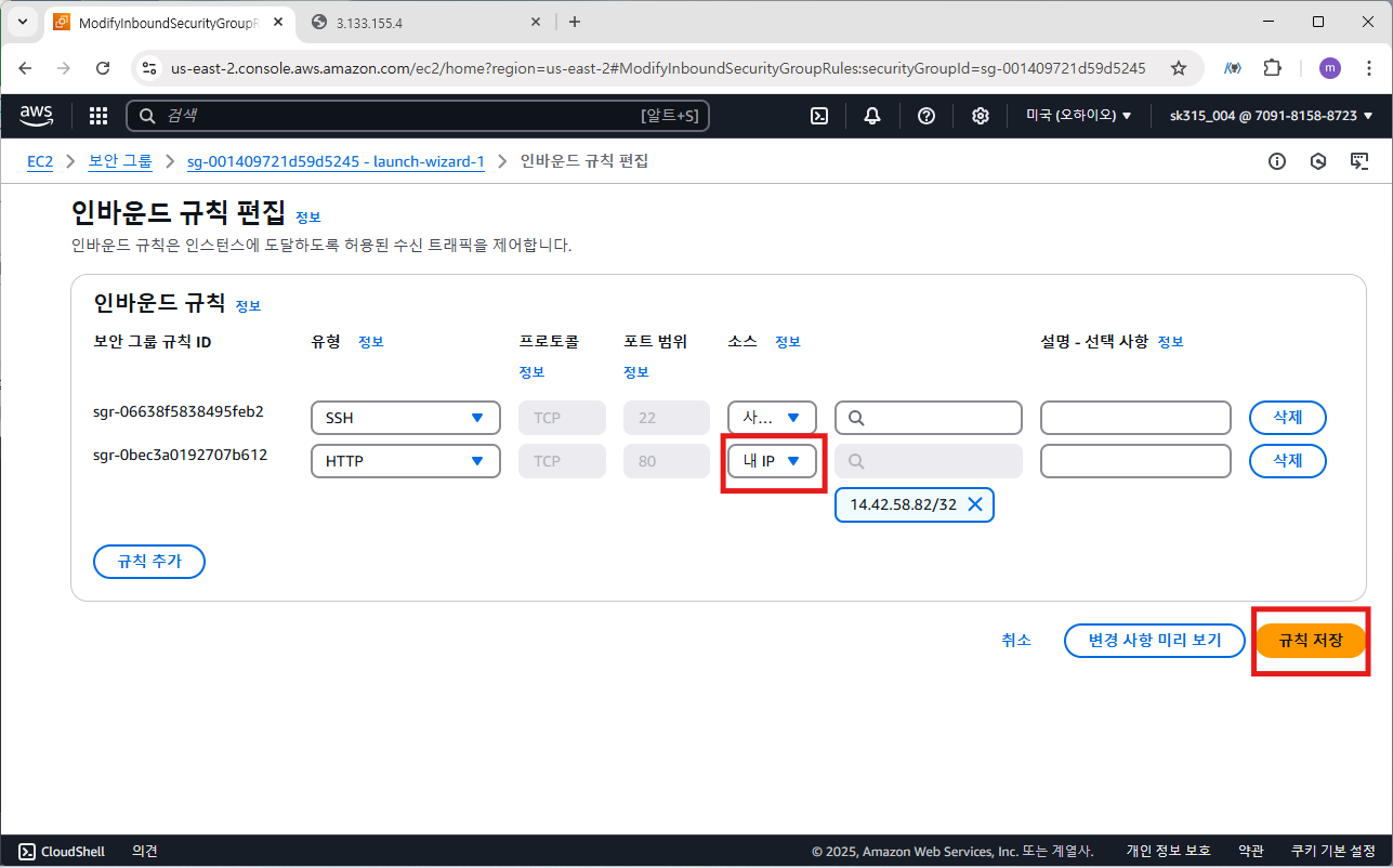 HTTP(80) 소스를 내 IP로 변경하고 규칙을 저장하게 되면 내 IP를 제외한 다른 네트워크에서는 접속이 제한된다.