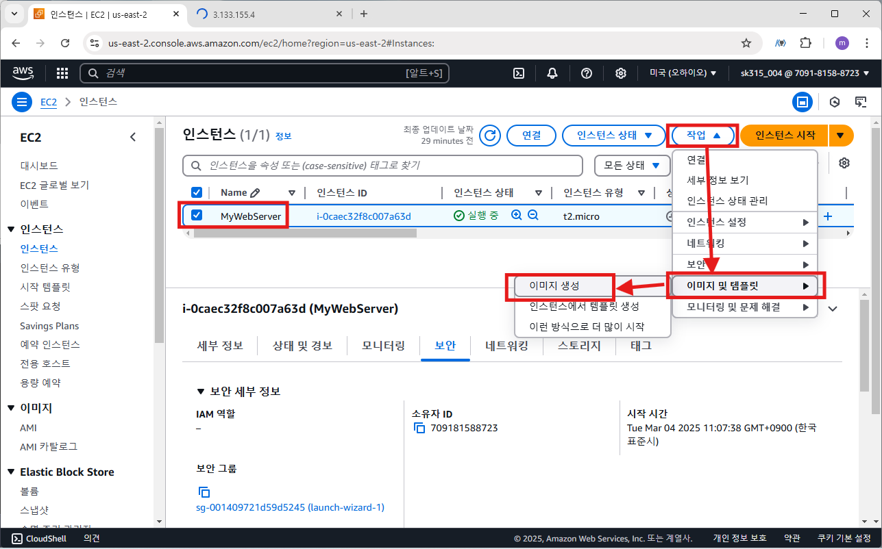 EC2 인스턴스 선택 > 작업 > 이미지 및 템플릿 > 이미지 생성 클릭
