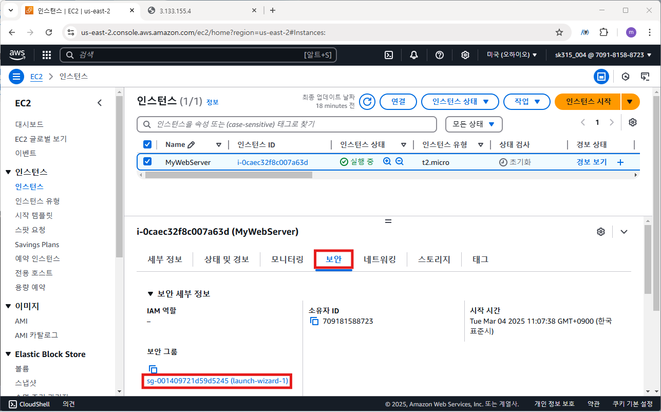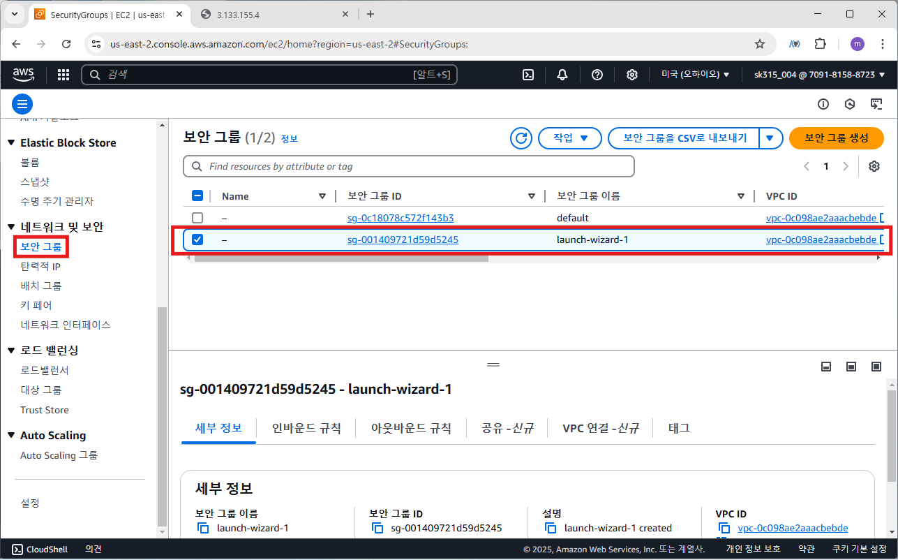 네트워크 및 보안>보안그룹으로 접속 or 인스턴스>보안 탭에서 클릭해서 이동해도 된다.