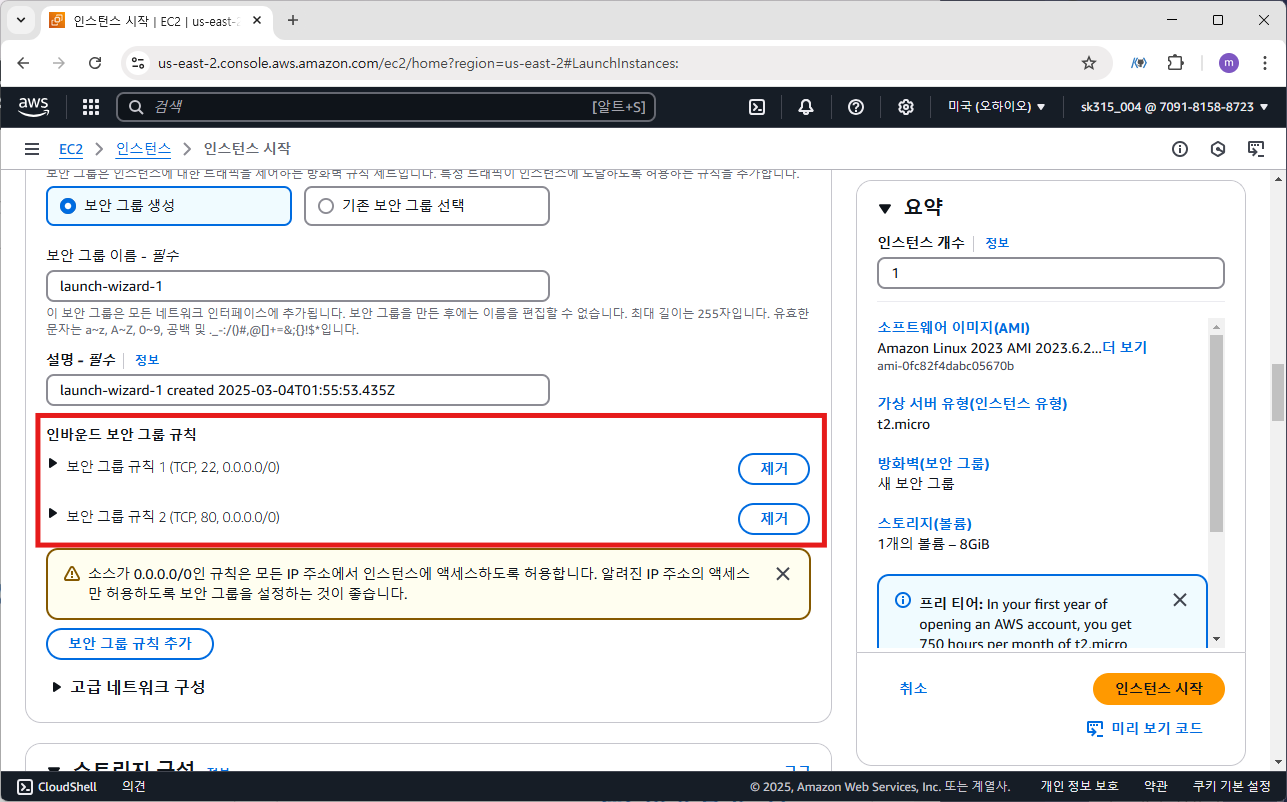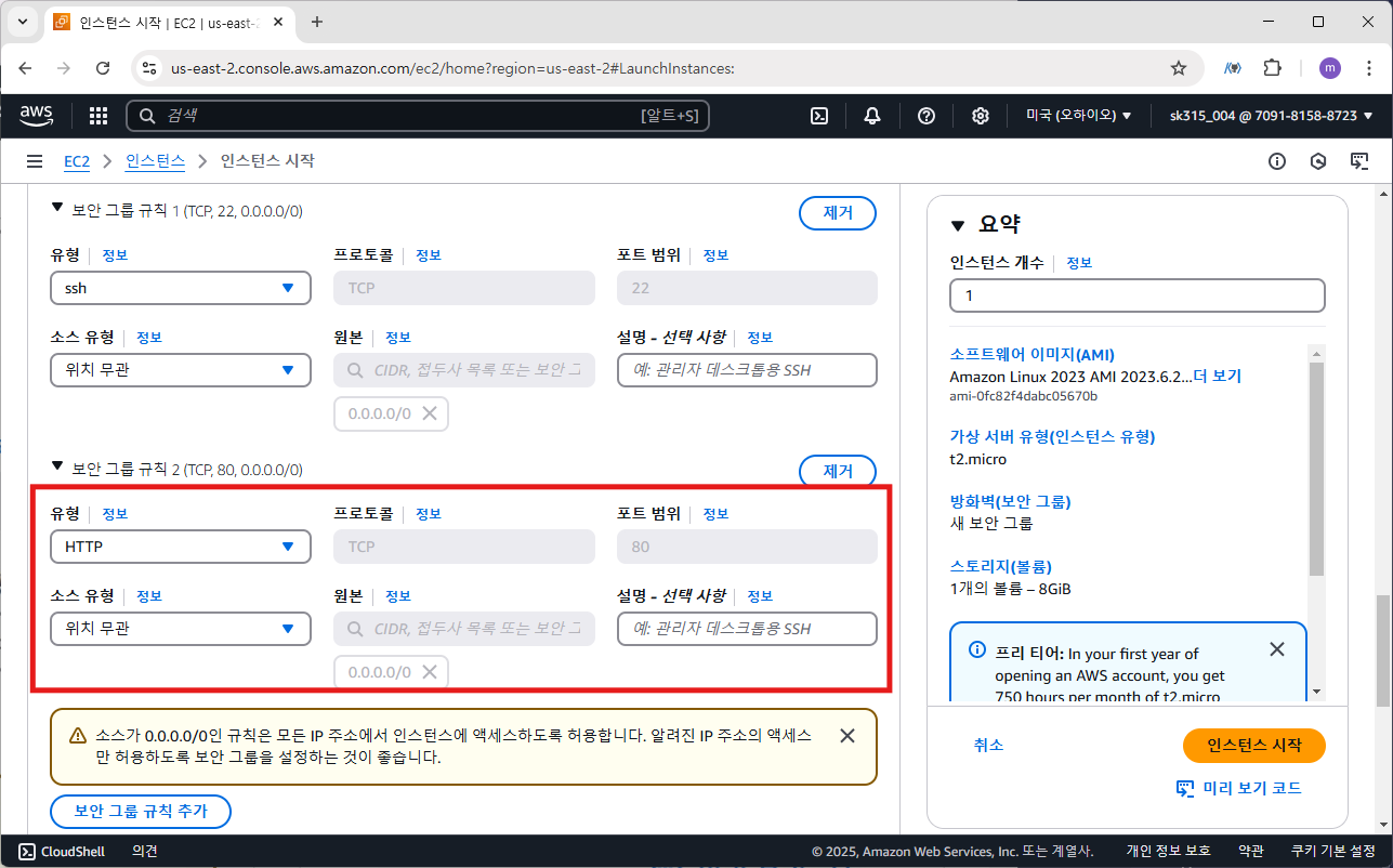 HTTP (TCP 80번 포트): 소스 유형을 위치 무관 (0.0.0.0/0)으로 설정