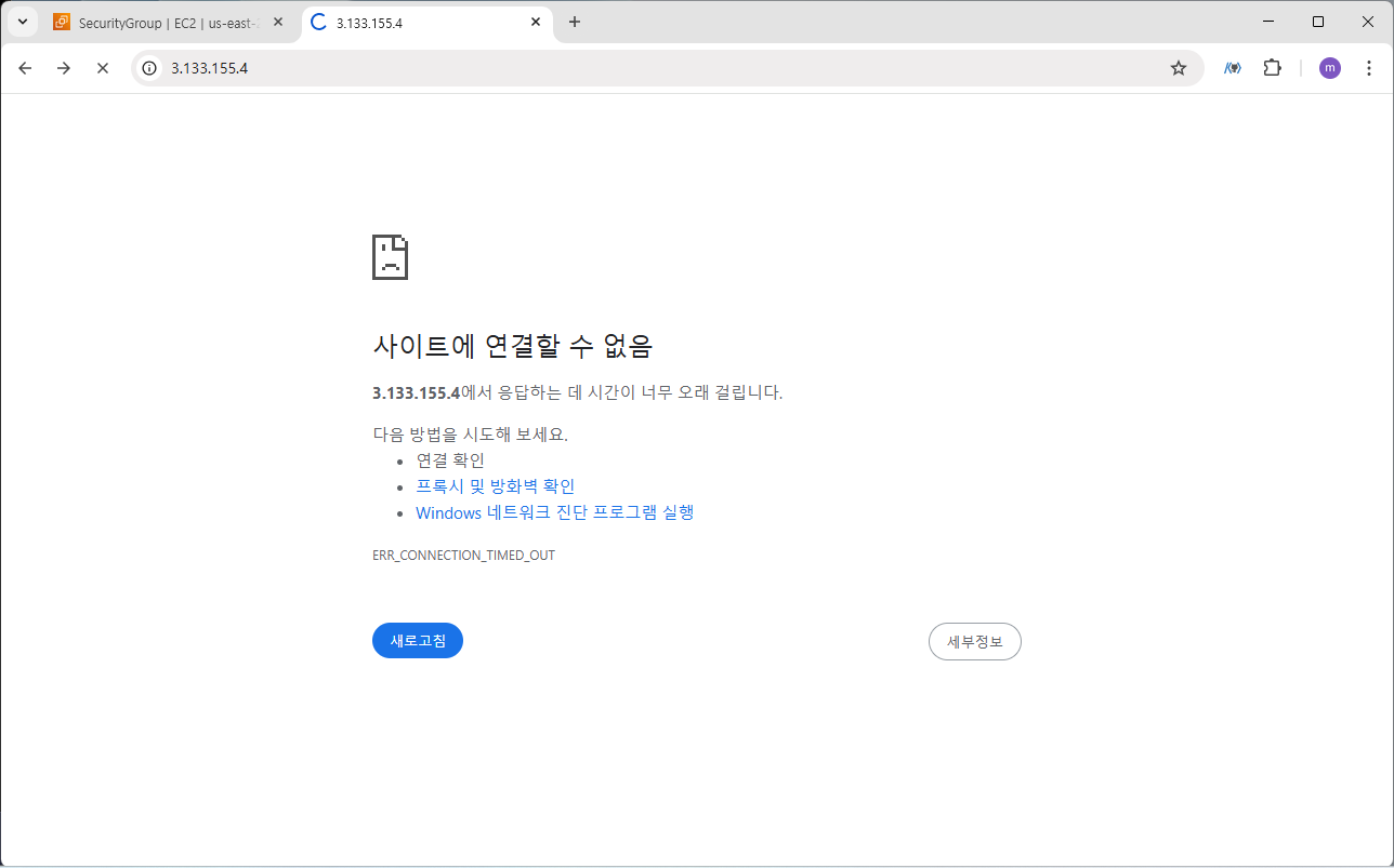 만약 인바운드 규칙에서 HTTP(80) 삭제하게 되면 내IP도 웹페이지 접근이 차단되는 것을 확인할 수 있다. 현재는 ssh 접속만 가능하게 된 상황이다.