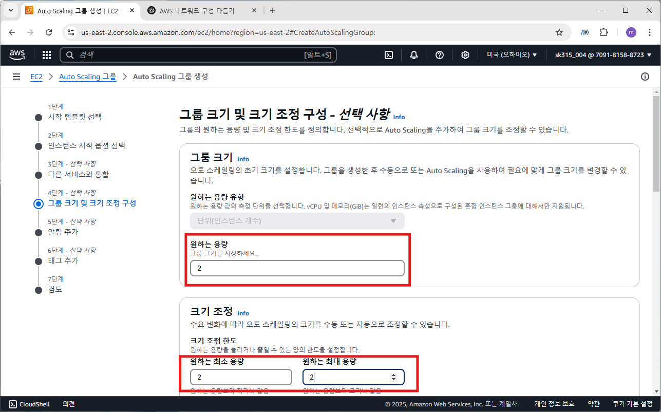 4단계로 넘어와서는 인스턴스 수를 설정하게 된다. 원하는 용량은 2, 최소 용량과 최대 용량도 2로 설정한다. 나머진 디폴트값으로 진행한다.