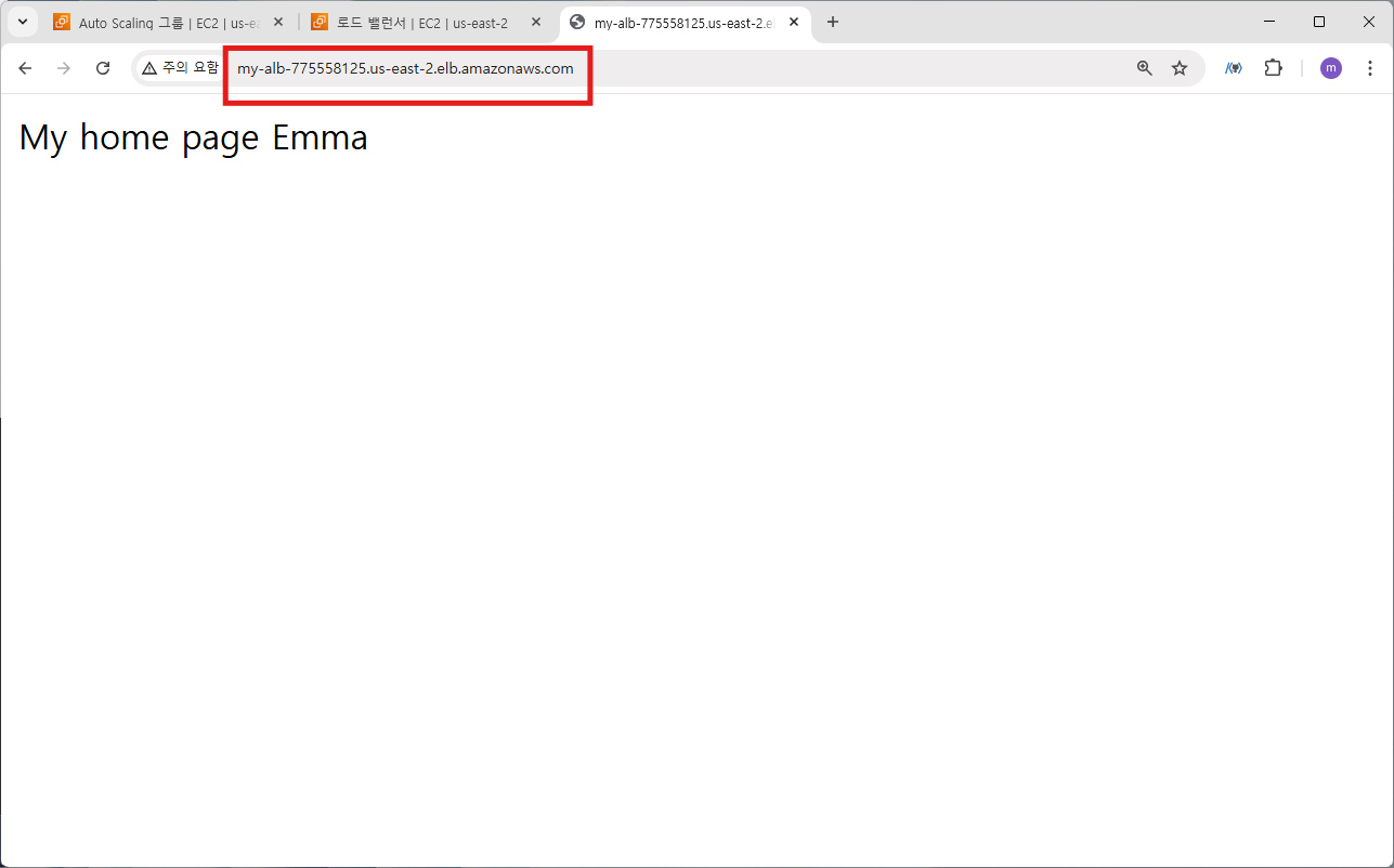 로드밸런서 MY-ALB의 DNS 이름을 브라우저에서 입력하여 웹페이지 접속을 확인해 본다.
