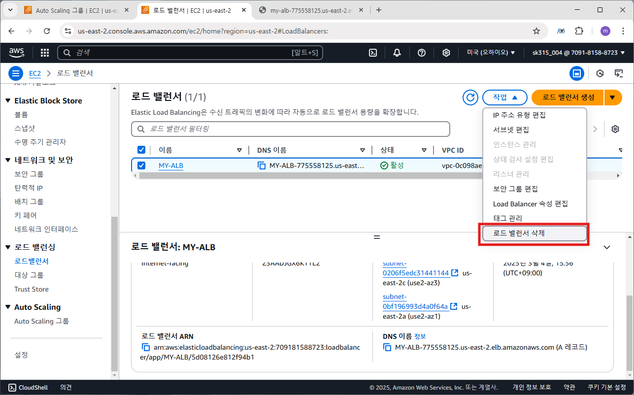 실습이 마무리 됐으므로 비용 과금을 방지하기 위해 지금까지 진행한 실습 자원들을 삭제하겠습니다. 먼저 ASG와 ELB를 삭제합니다.