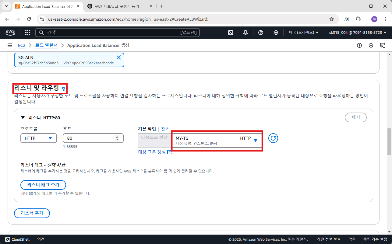 리스너 및 라우팅도 앞서 생성한 대상 그룹인 MY-TG로 선택합니다.