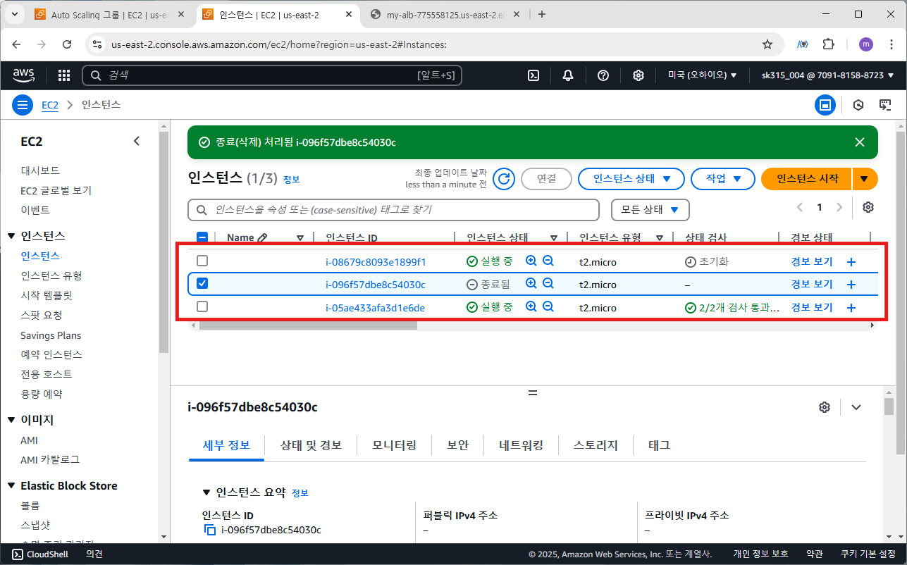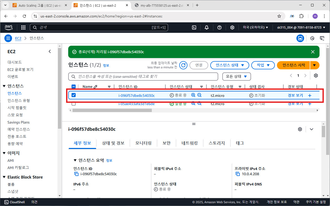 이제 EC2 인스턴스를 종료 후 ASG에 의해 자동 복구되는 것을 확인하겠습니다. 최소 인스턴스 수를 2로 설정했기 때문에 2개의 현재 인스턴스 중 임의의 인스턴스를 삭제하면 ASG에서 자동으로 새로운 인스턴스를 생성할 것입니다.
