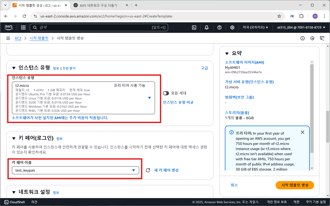 인스턴스 유형은 t2.micro, 키페 어는 자신의 키페어를 선택합니다.
