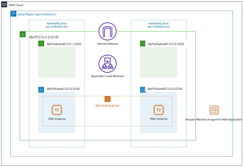 AWS의 ALB(Application Load Banlancer)와 ASG(Auto Scaling Group)을 활용하여 고가용성 아키텍처를 구성하는 과정을 정리했습니다. 목표 아키텍처는 위 그림과 같고 네트워크 구성은 이전 실습에서 진행했던 myvpc를 동일하게 사용했습니다.