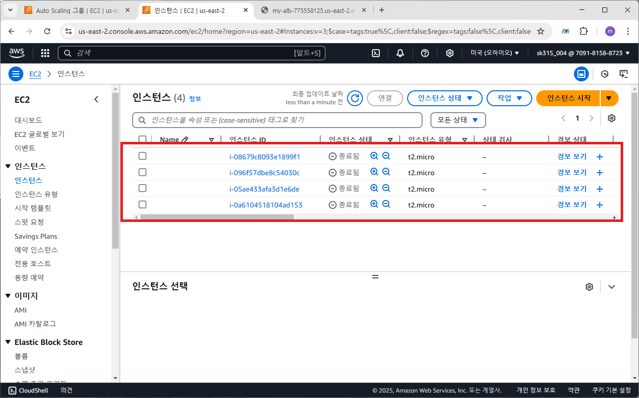 위와 같이 선택한 인스턴스는 종료되고 새로운 인스턴스가 실행 중 상태로 생성된 것을 볼 수 있다. ASG가 정상적으로 작동하는 것을 확인할 수 있다.