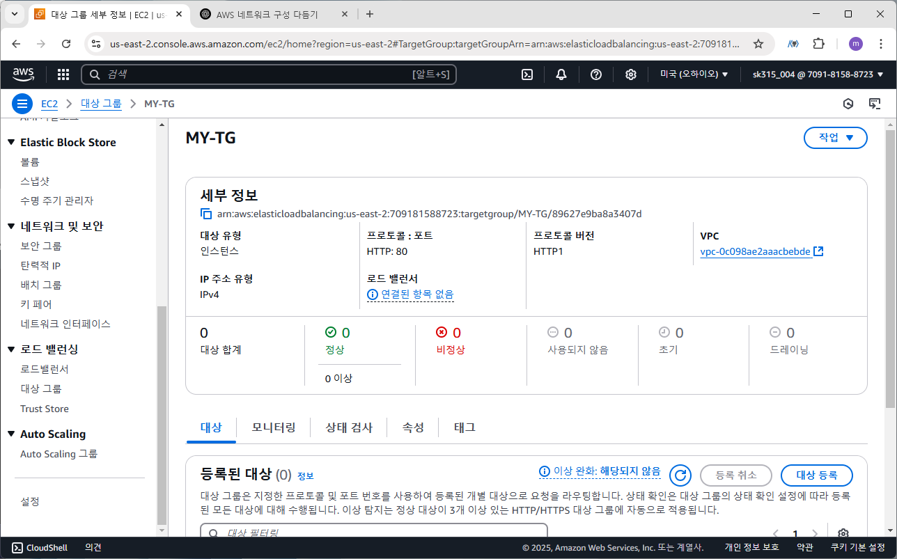 위 그림과 같이 대상 그룹(MY-TG)이 생성된 것을 볼 수 있습니다. 현재 등록된 대상은 없습니다.