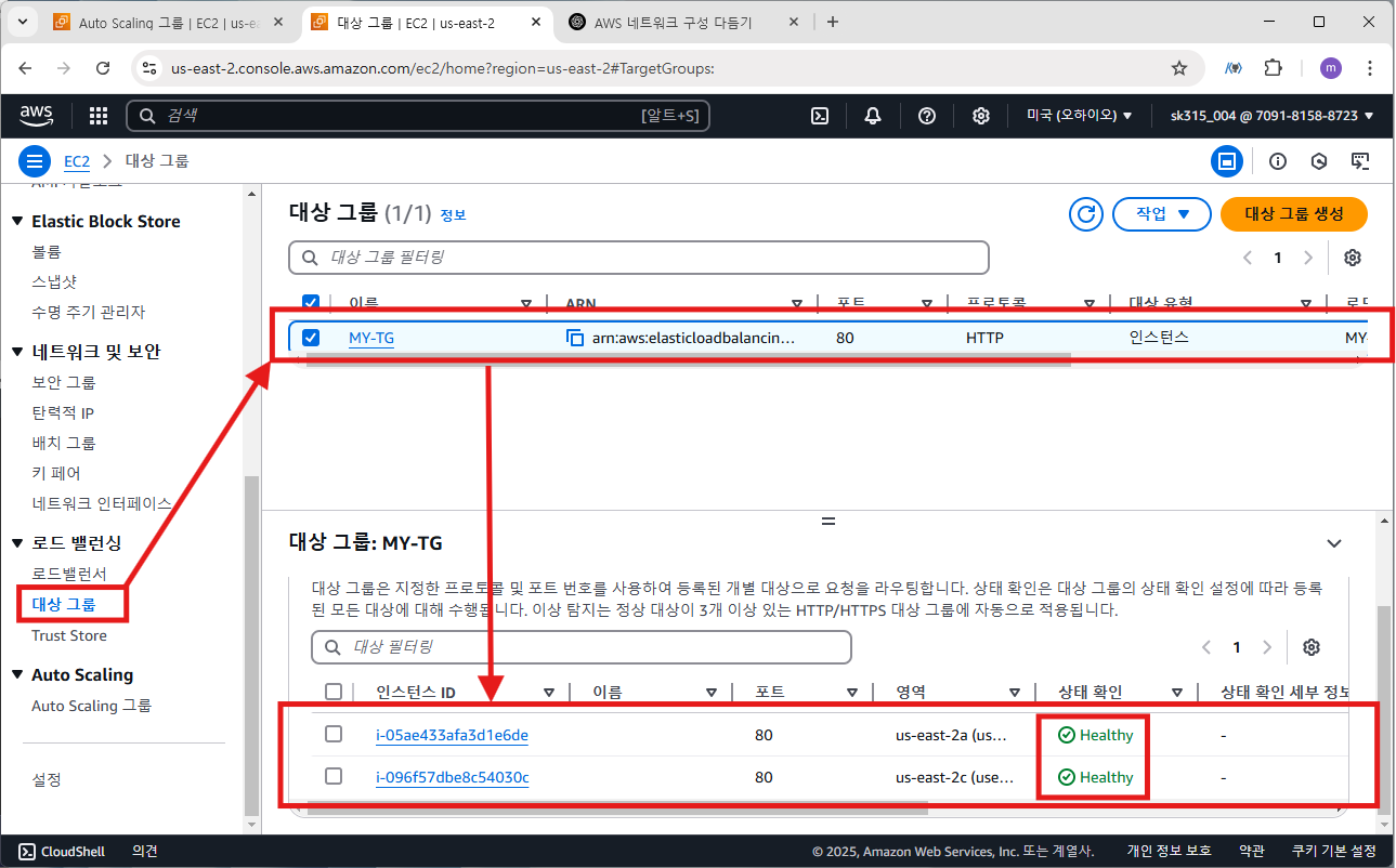 대상 그룹 상태를 확인해 보면 healthy로 정상적인 것을 볼 수 있다.