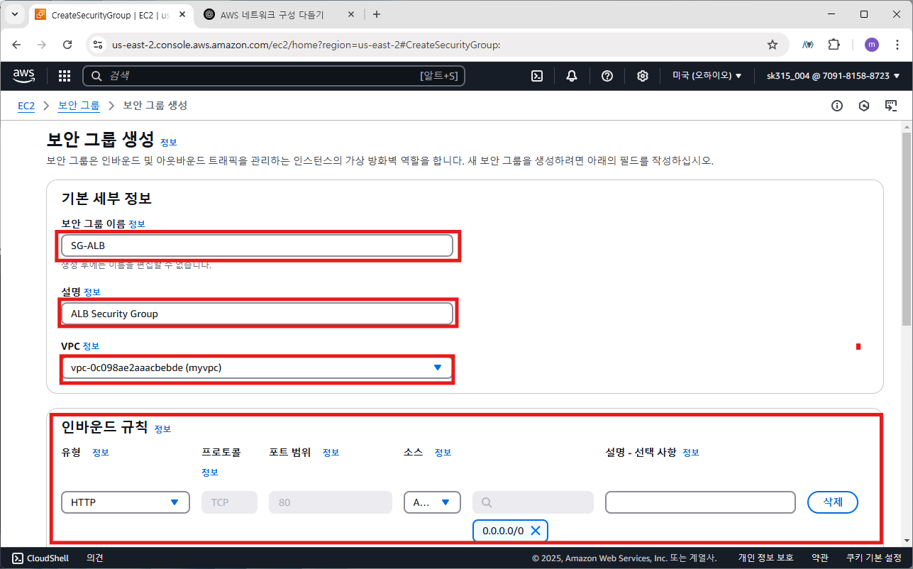 목표 아키텍처에서 구성을 위해 보안 그룹 2개를 생성해야 합니다. 먼저 ALB 보안 그룹을 생성하겠습니다.