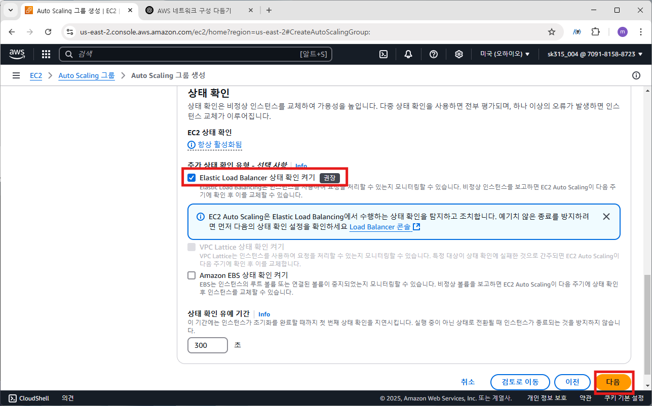 맨 아래에 상태 확인에서 ELB 상태 확인 활성화한다.