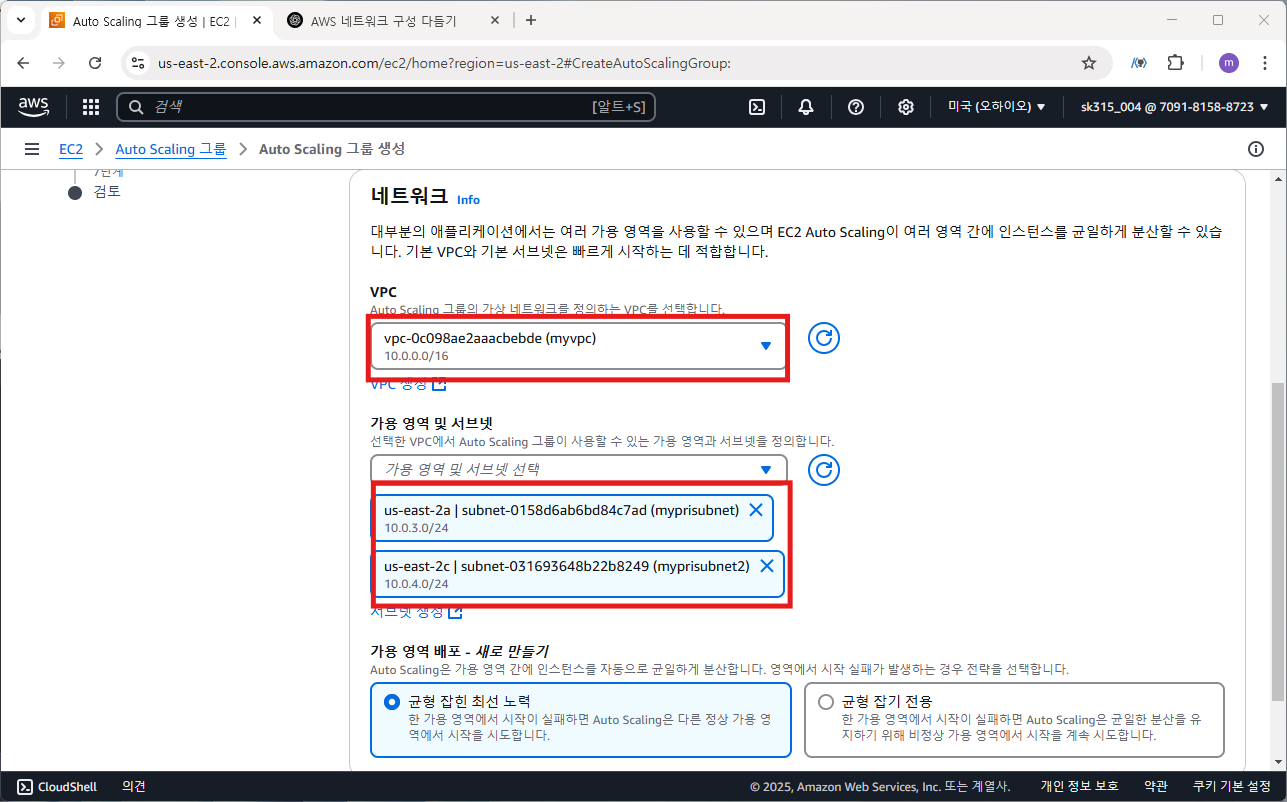 2단계 인스턴스 시작 옵션 선택으로 넘어와서 vpc는 myvpc, 가용영역 및 서브넷은 myvpc의 프라이빗 서브넷 두 개를 선택한다.