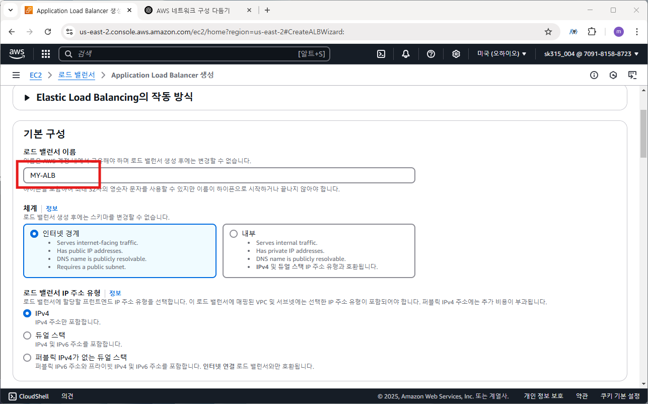 로드 밸런서 유형은 애플리케이션 로드 밸런서(ALB)로 선택합니다.