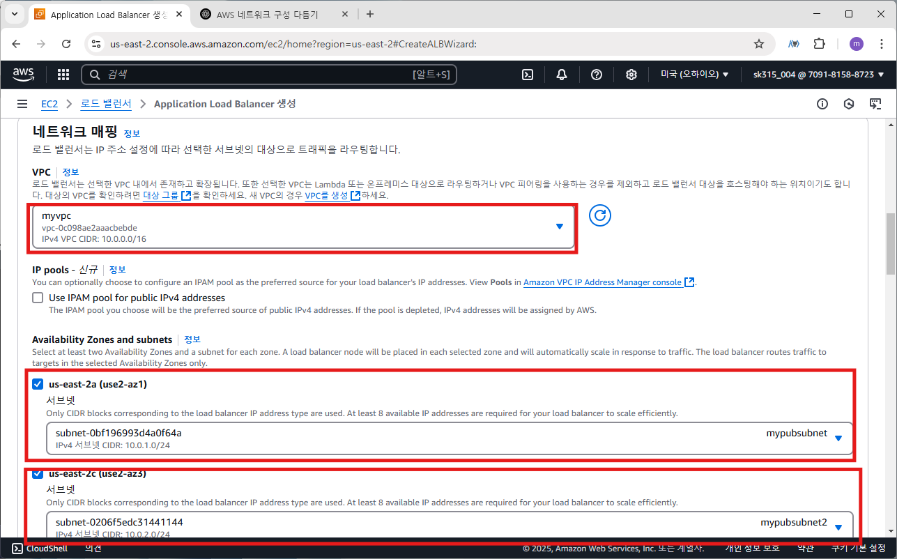 퍼블릭 서브넷은 mypubsubnet1, mypubsubnet2로 선택합니다.