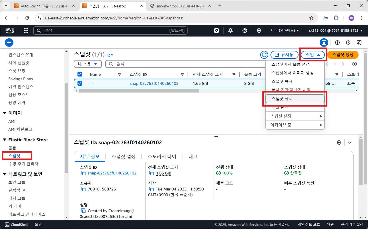 AMI 이미지를 지워도 관련 스냅샷이 남아 있기 때문에 EC2 > 스냅샷에서 관련 스냅샷 삭제 (비용 절감)합니다.