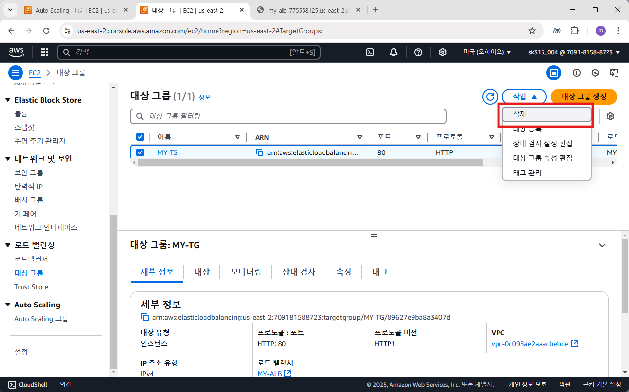 EC2 > 대상 그룹에서 MY-TG 삭제