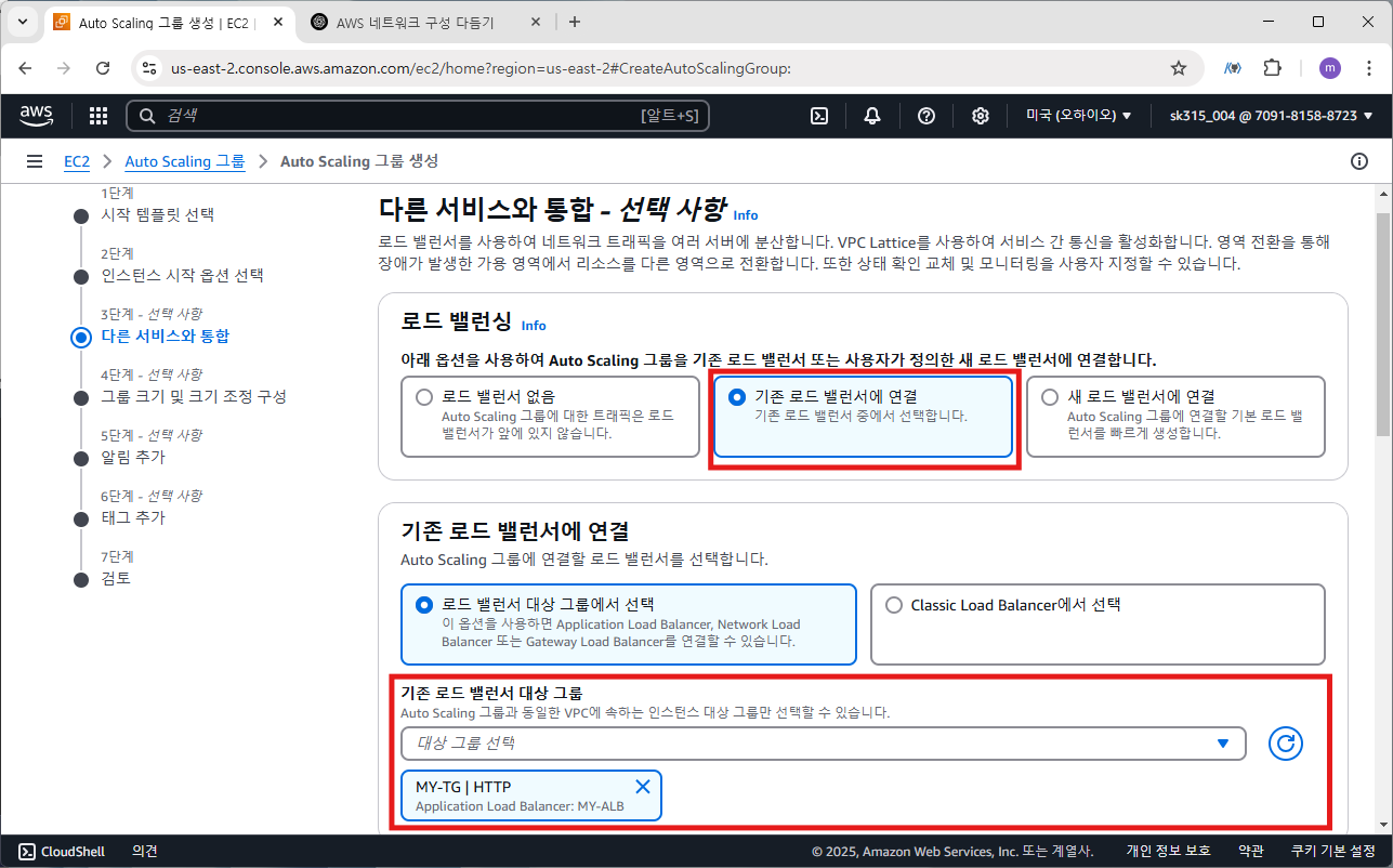 3단계 다른 서비스와 통합에서는 로드밸런싱을 기존 로드 밸런서에 연결 선택, 기존 로드밸런서 대상 그룹은 앞서 생성한 MY-TG로 선택한다.