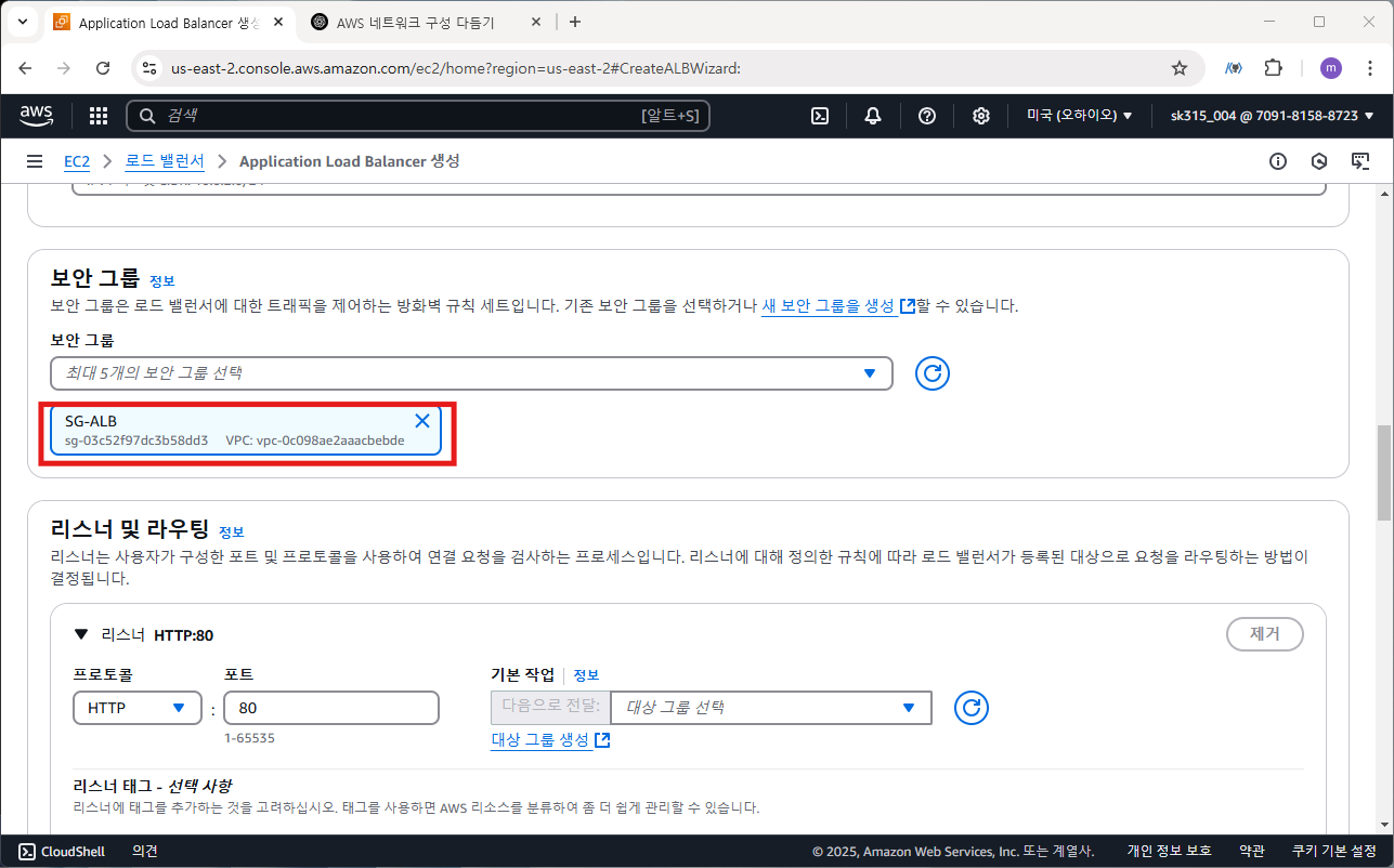 보안 그룹은 앞서 만든 SG-ALB로 선택, 기본값은 삭제합니다.