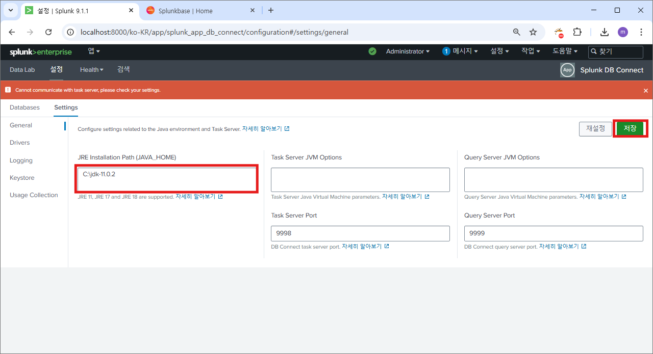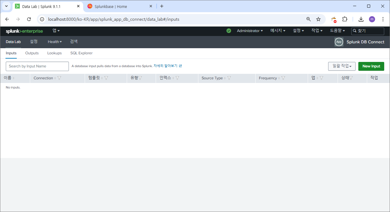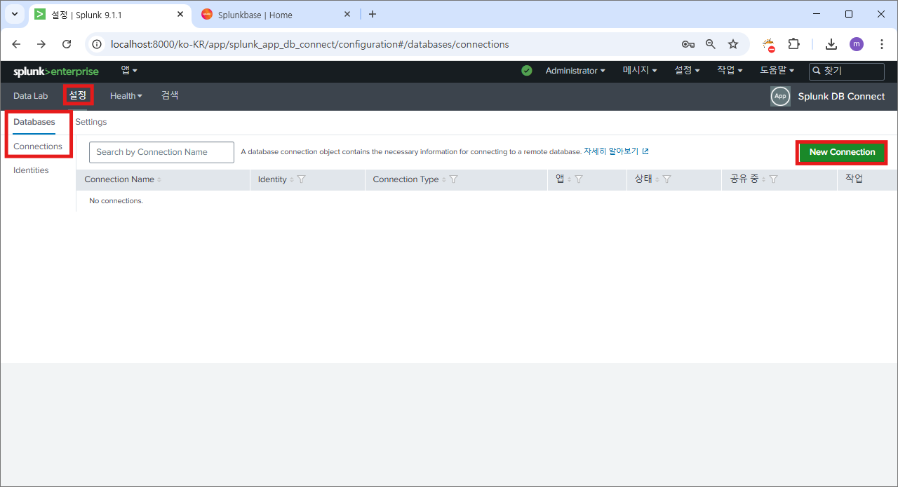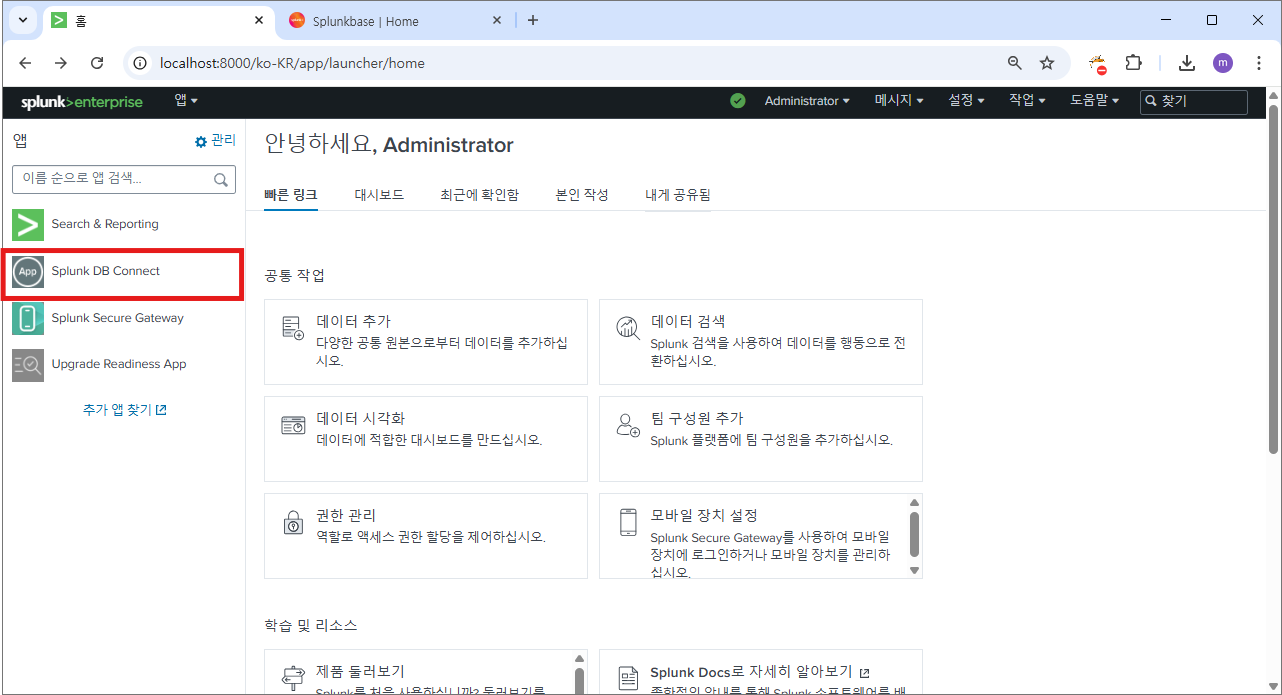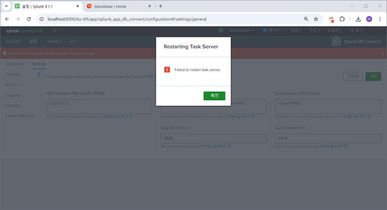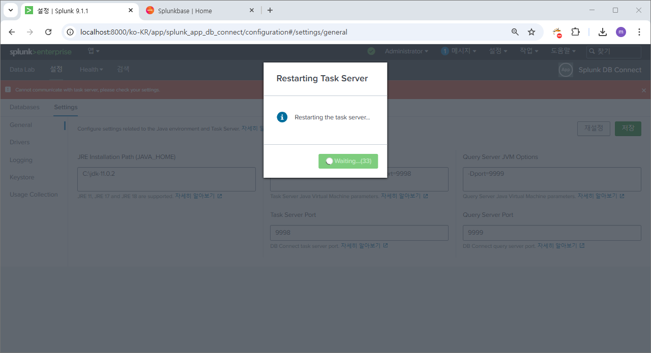 재시작 후에 다시 splunk db connect로 이동하면?