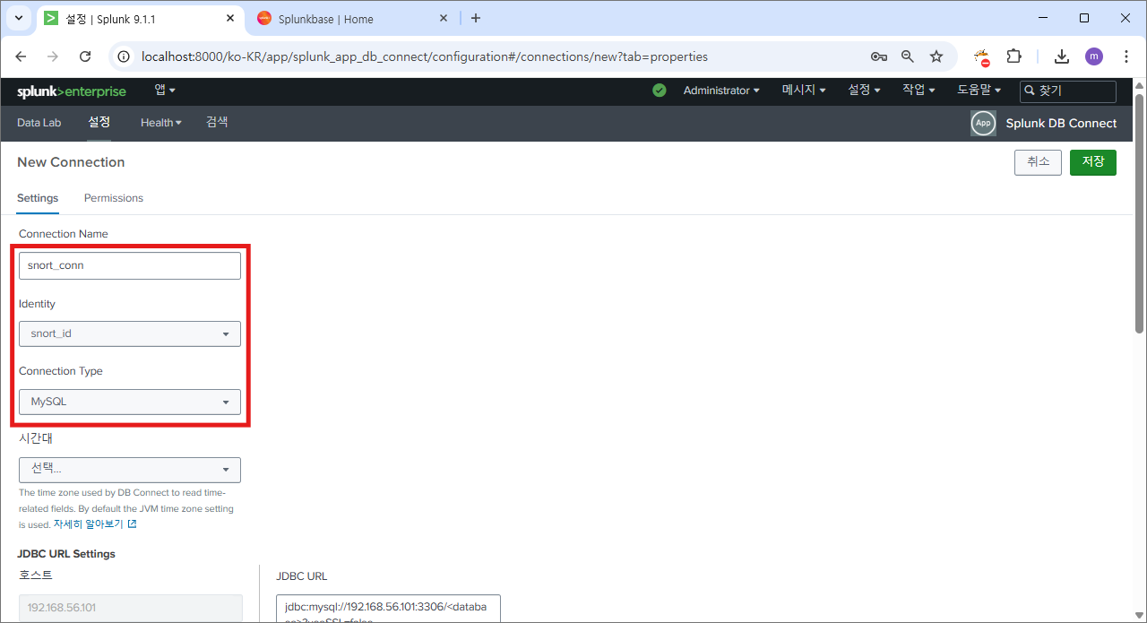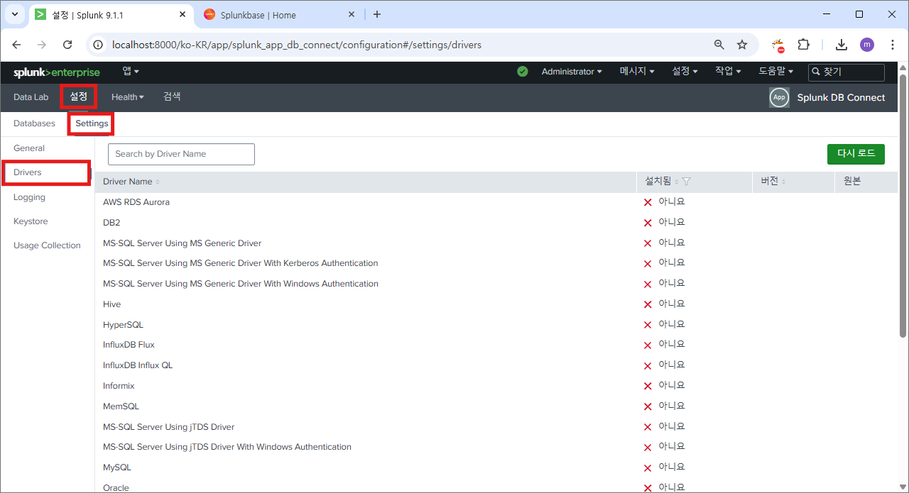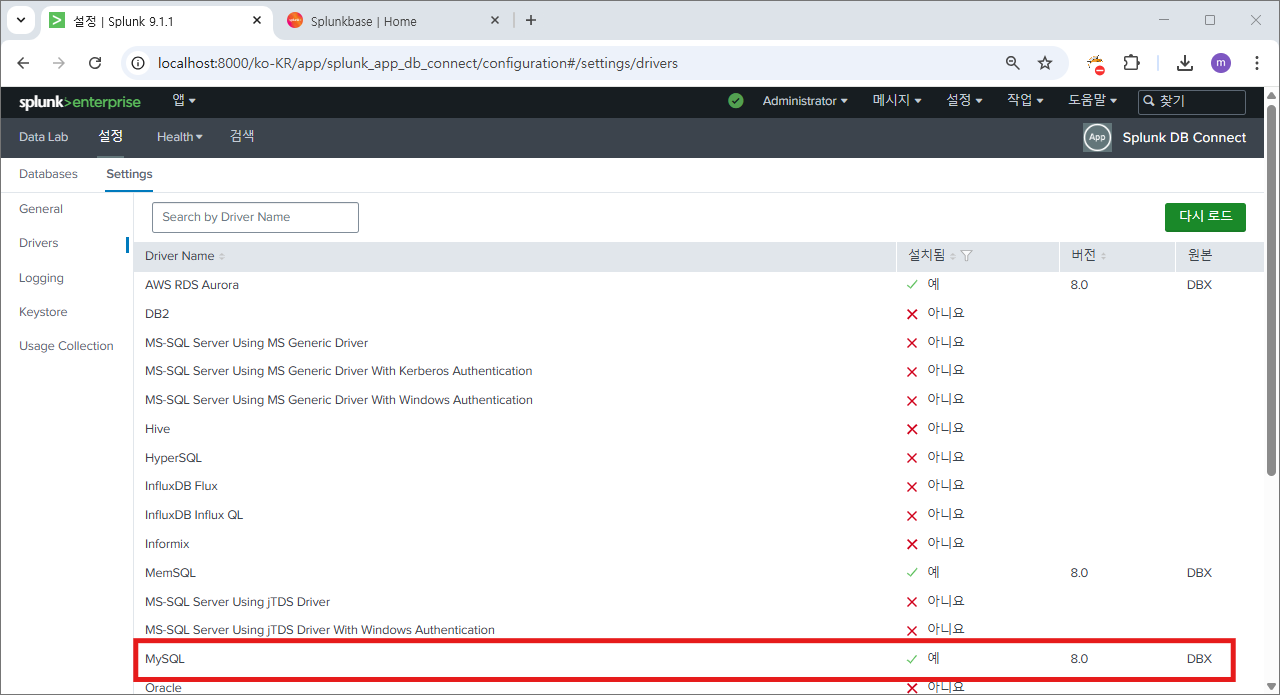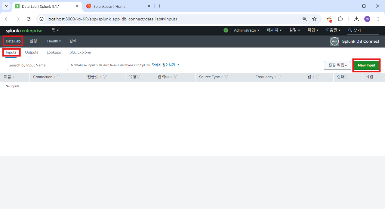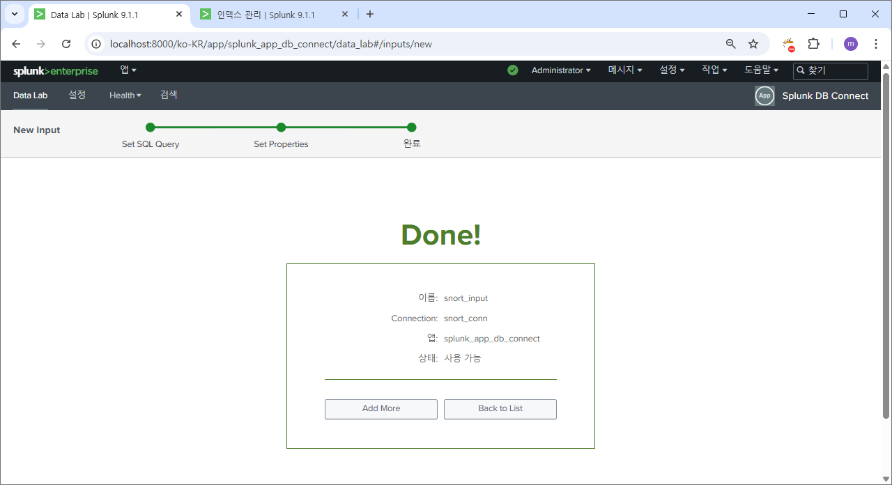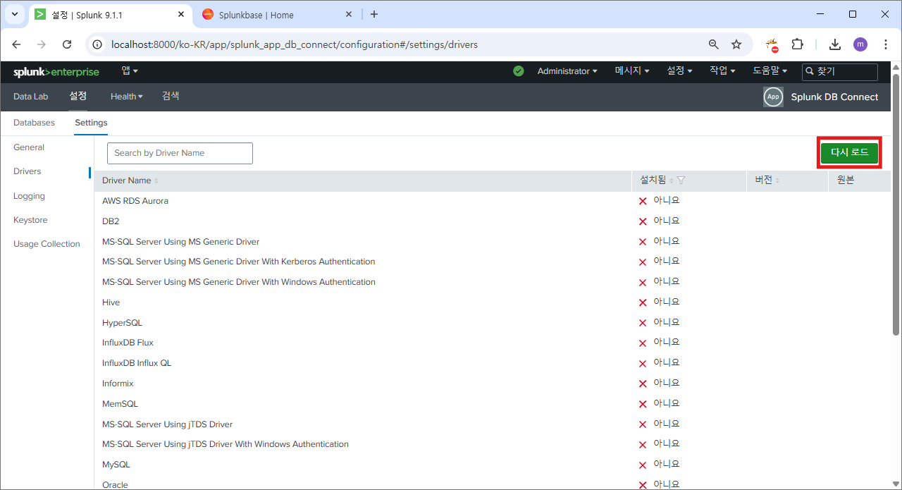 재시작 후에 다시 splunk db connect로 이동하면?