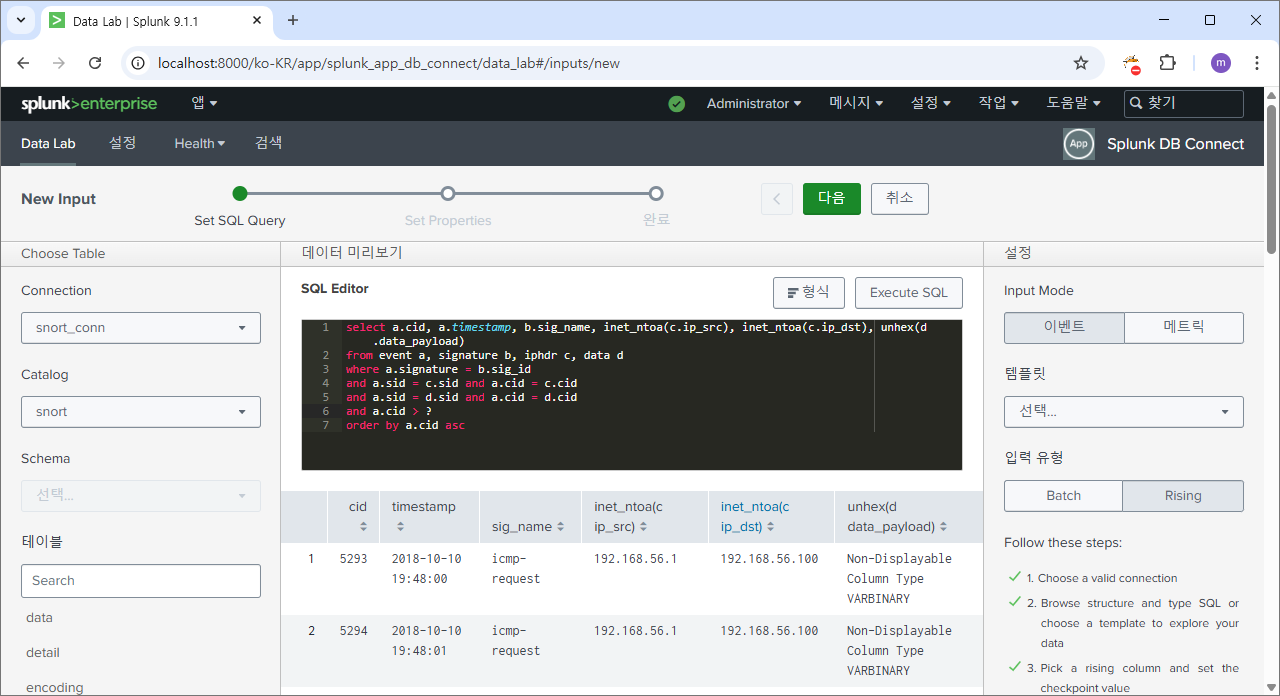 snortdb 인덱스 만들고 input 정책은 위와 같이 설정