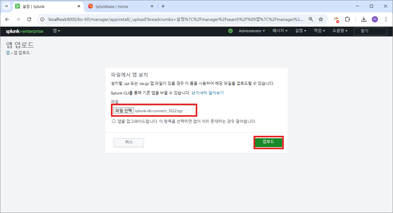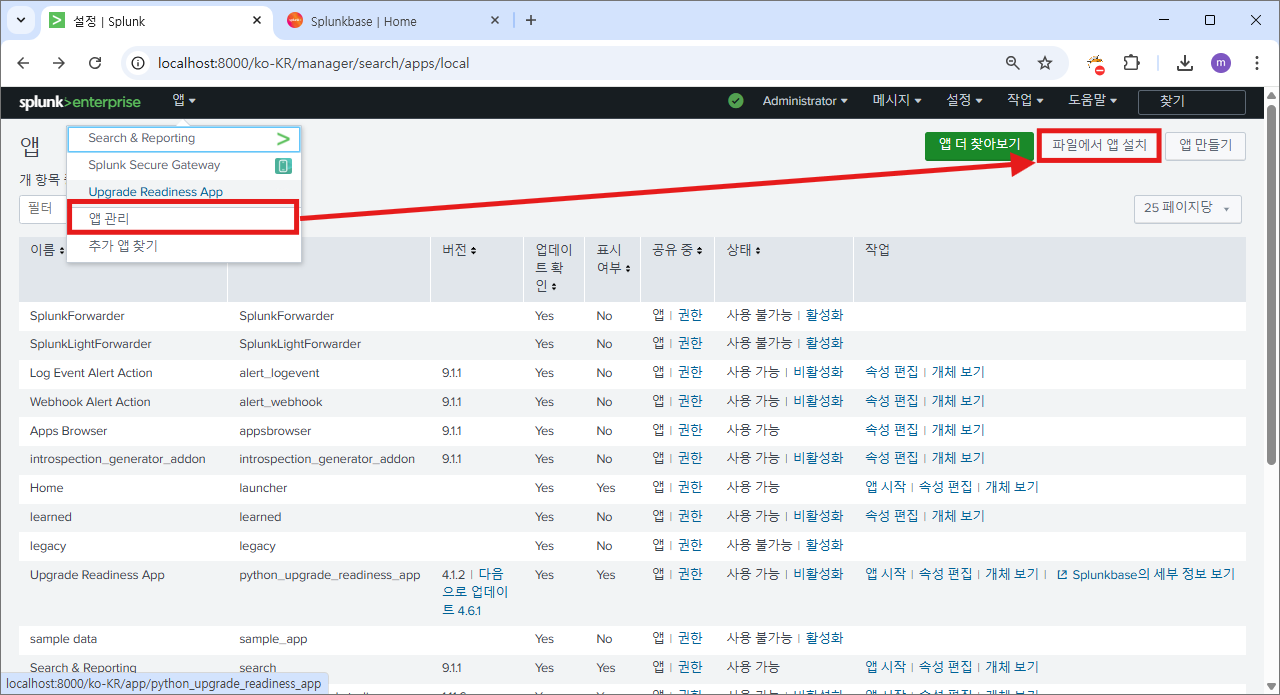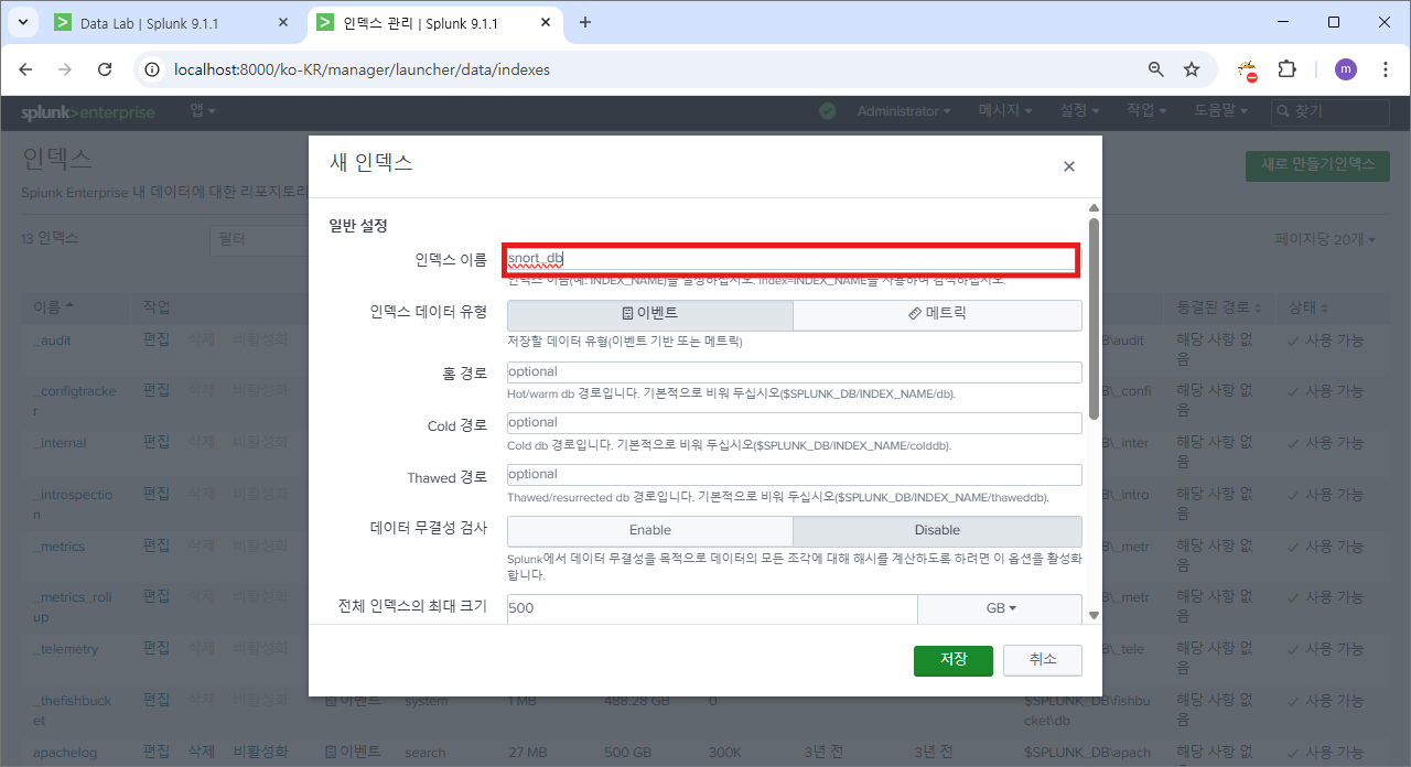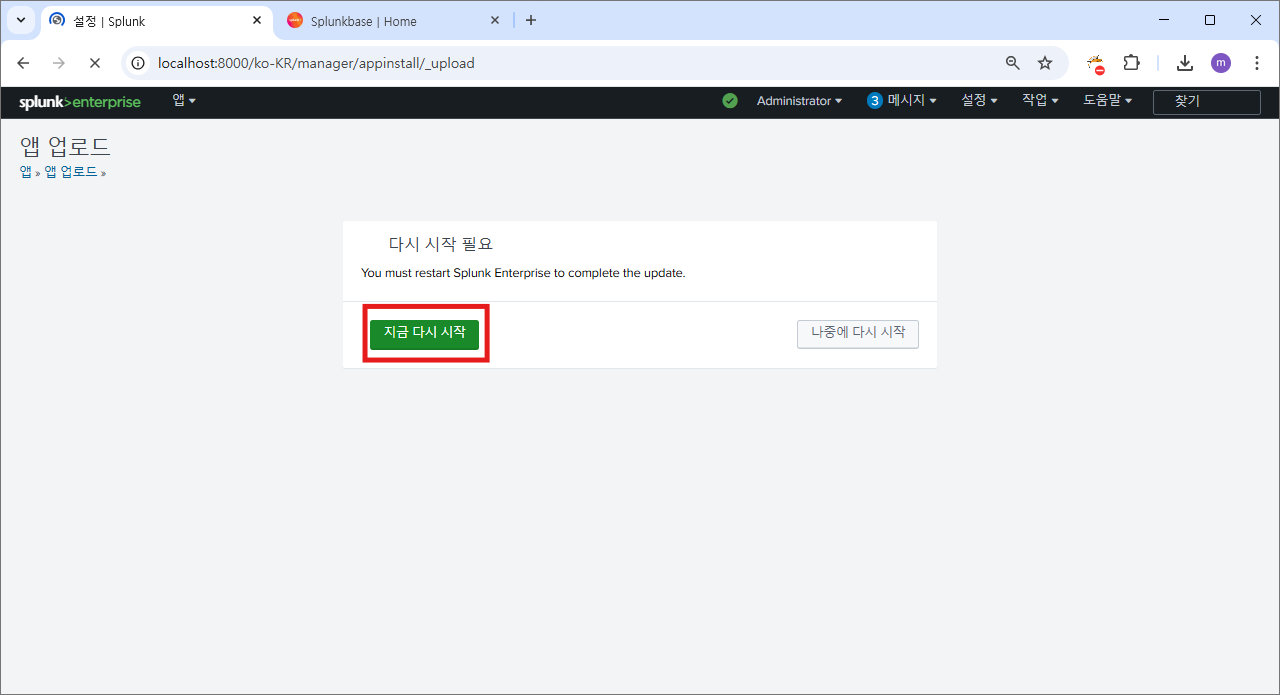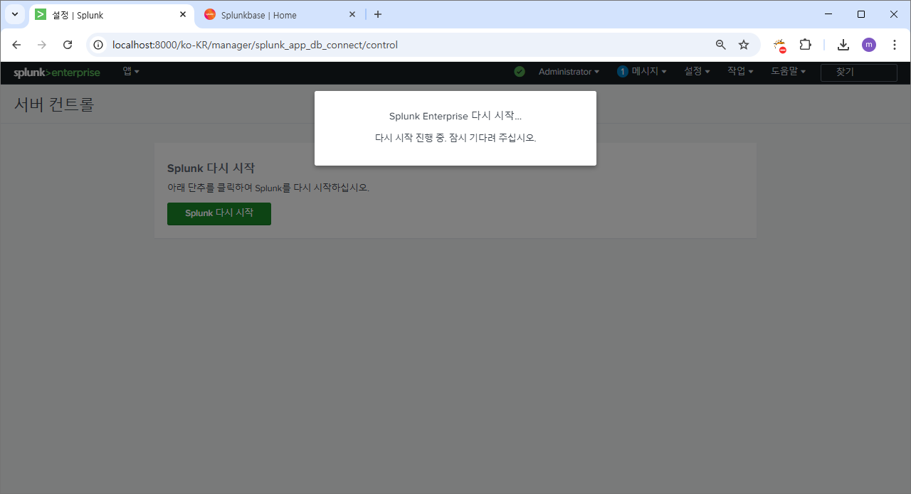 설정>서버 컨트롤 로 이동해서 스플렁크 다시 시작 버튼으로 재시작 한다.