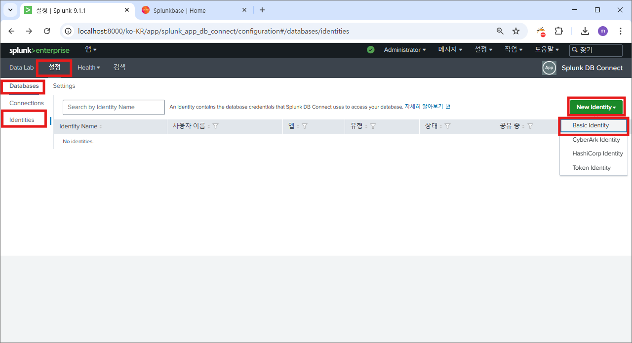 설정>Databases>Idnetites>New Identity>Basic Identity