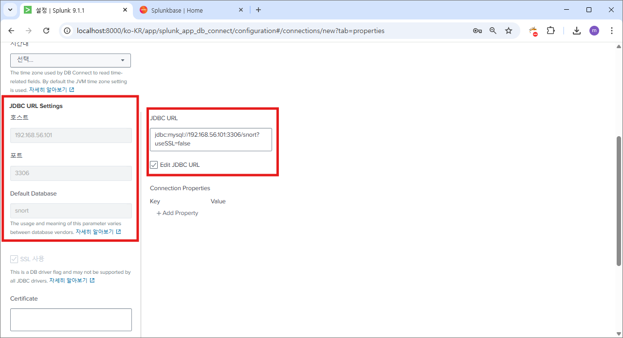 ssl 통신을 이용하지 않기 때문에 JDBC URL을 편집해서 useSSL 값을 false로 변경한다.
