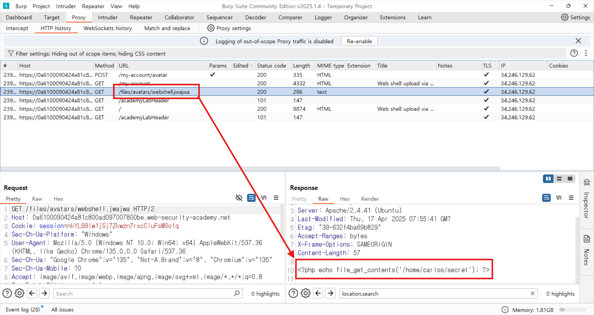 To solve the lab, upload a basic PHP web shell, then use it to exfiltrate the contents of the file /home/carlos/secret. Submit this secret using the button provided in the lab banner.
