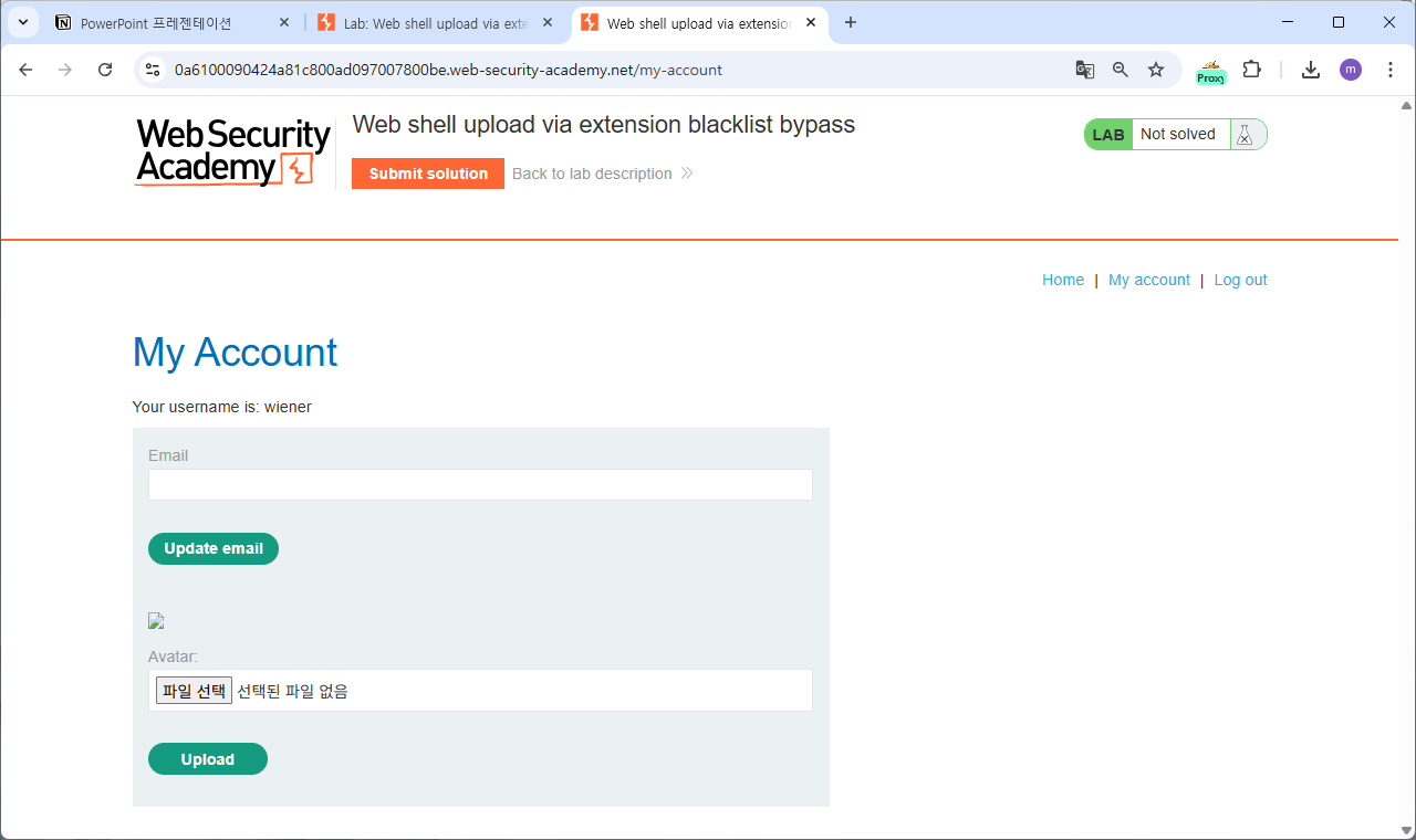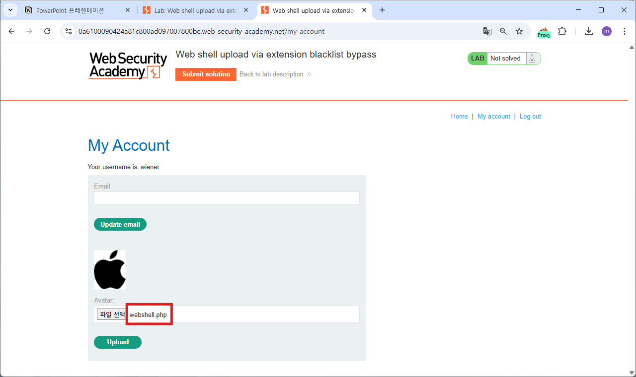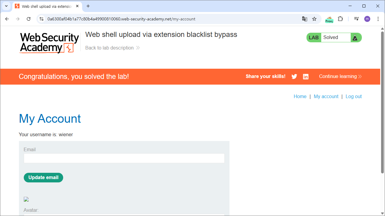 문제를 해결하려면 기본 PHP 웹 셸을 업로드한 후, 이를 사용해서 /home/carlos/secret 파일 내용을 추출해야 한다. 랩 배너에 제공된 버튼을 사용하여 플래그?를 제출하면 된다.