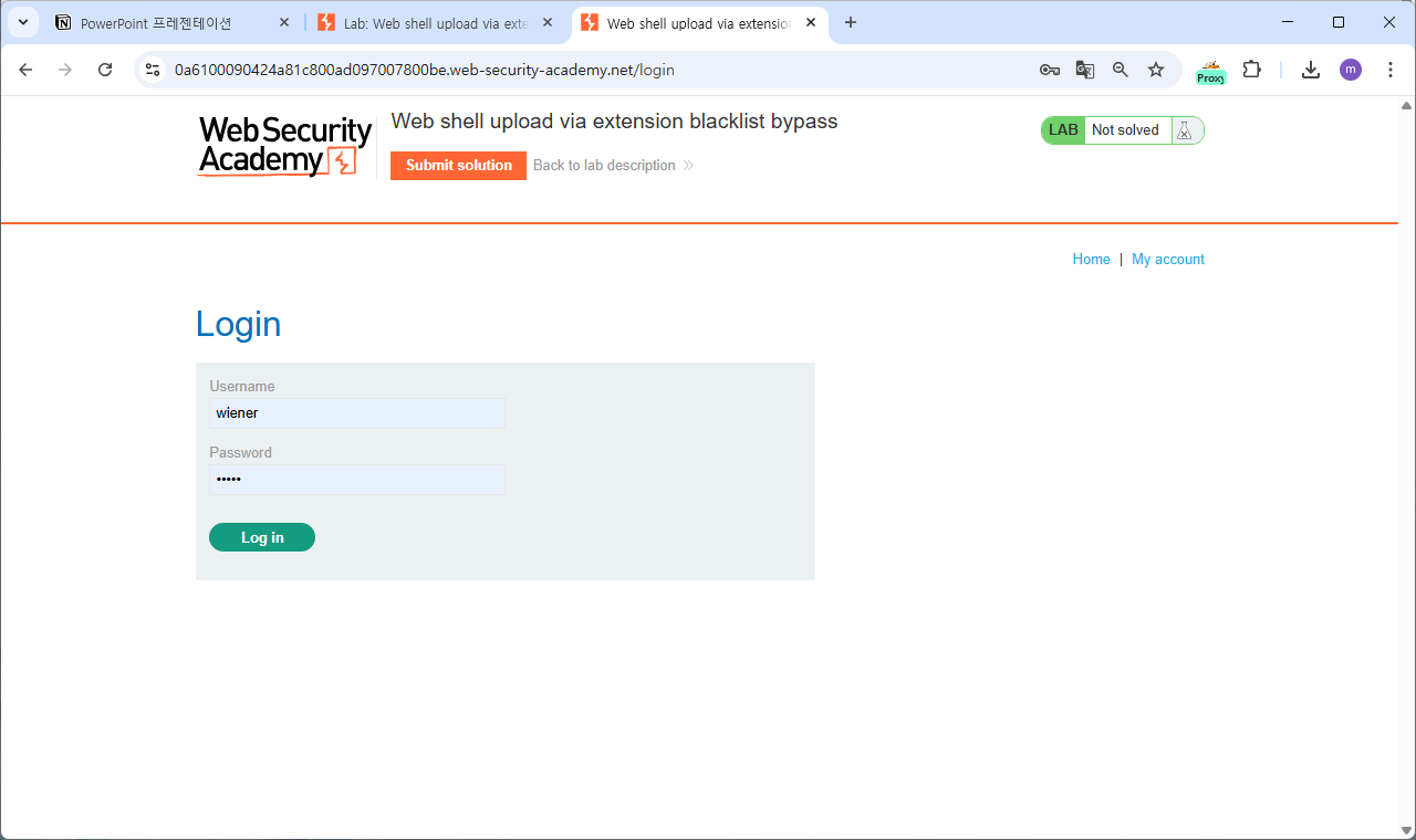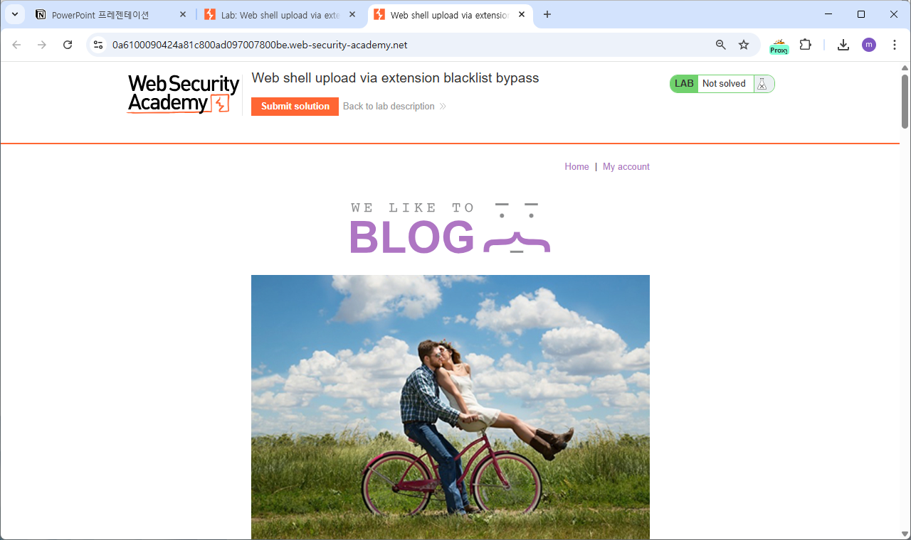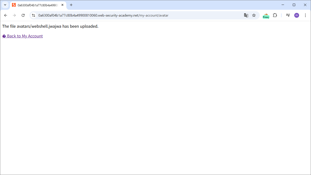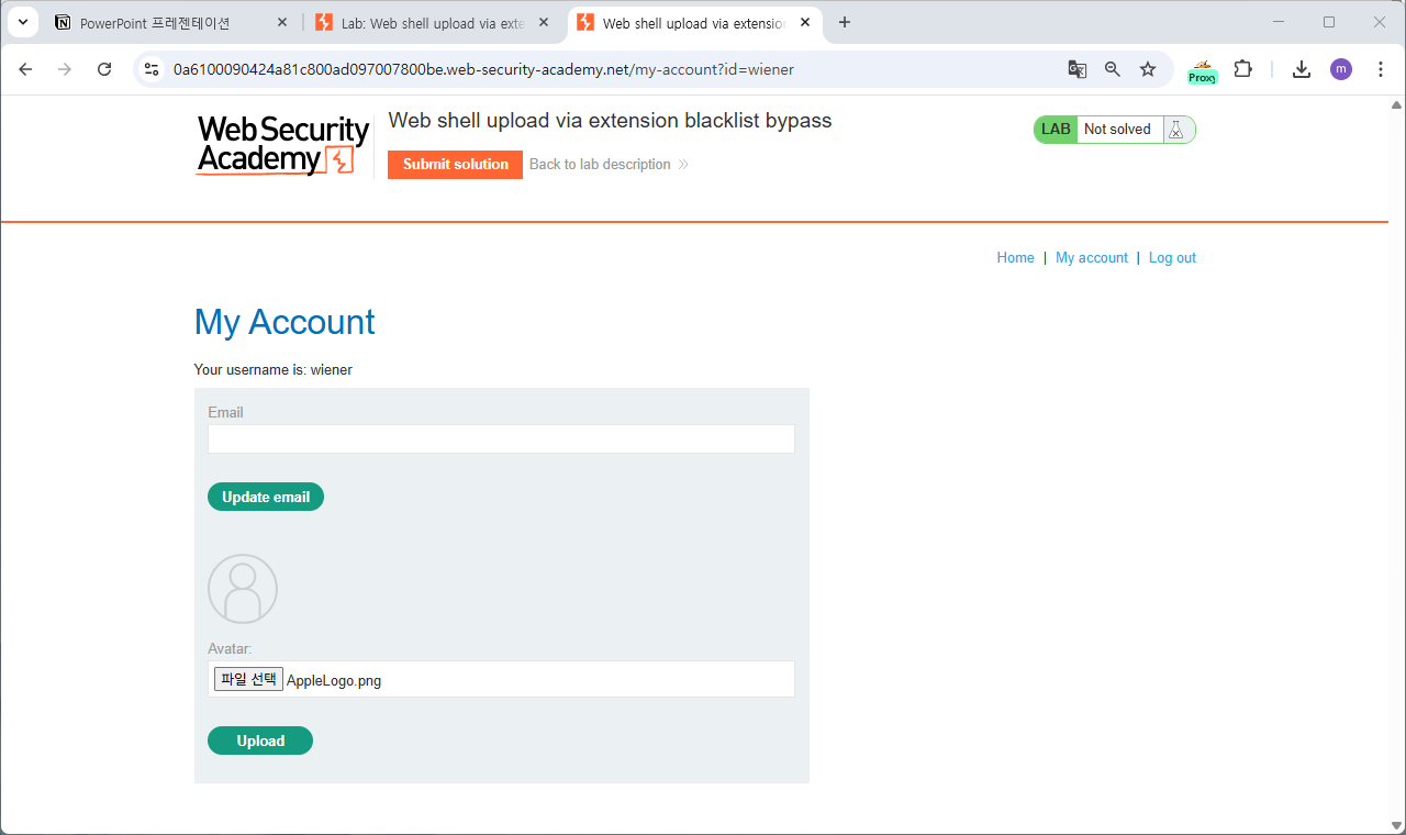 문제를 해결하려면 기본 PHP 웹 셸을 업로드한 후, 이를 사용해서 /home/carlos/secret 파일 내용을 추출해야 한다. 랩 배너에 제공된 버튼을 사용하여 플래그?를 제출하면 된다.