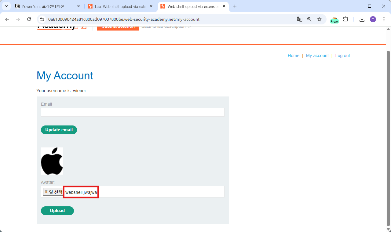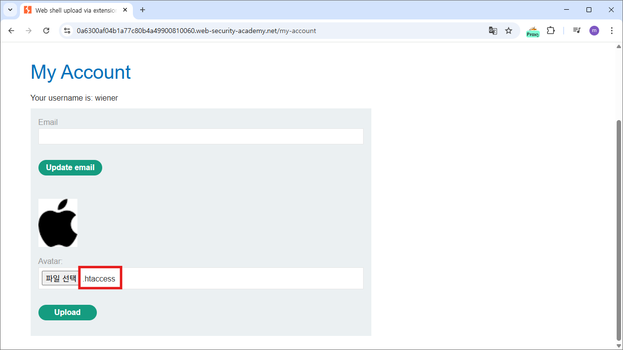 로그인을 완료하면 My Account 페이지로 이동되고 파일 업로드 기능을 확인할 수 있다. 임의의 이미지 파일을 업로드한다.