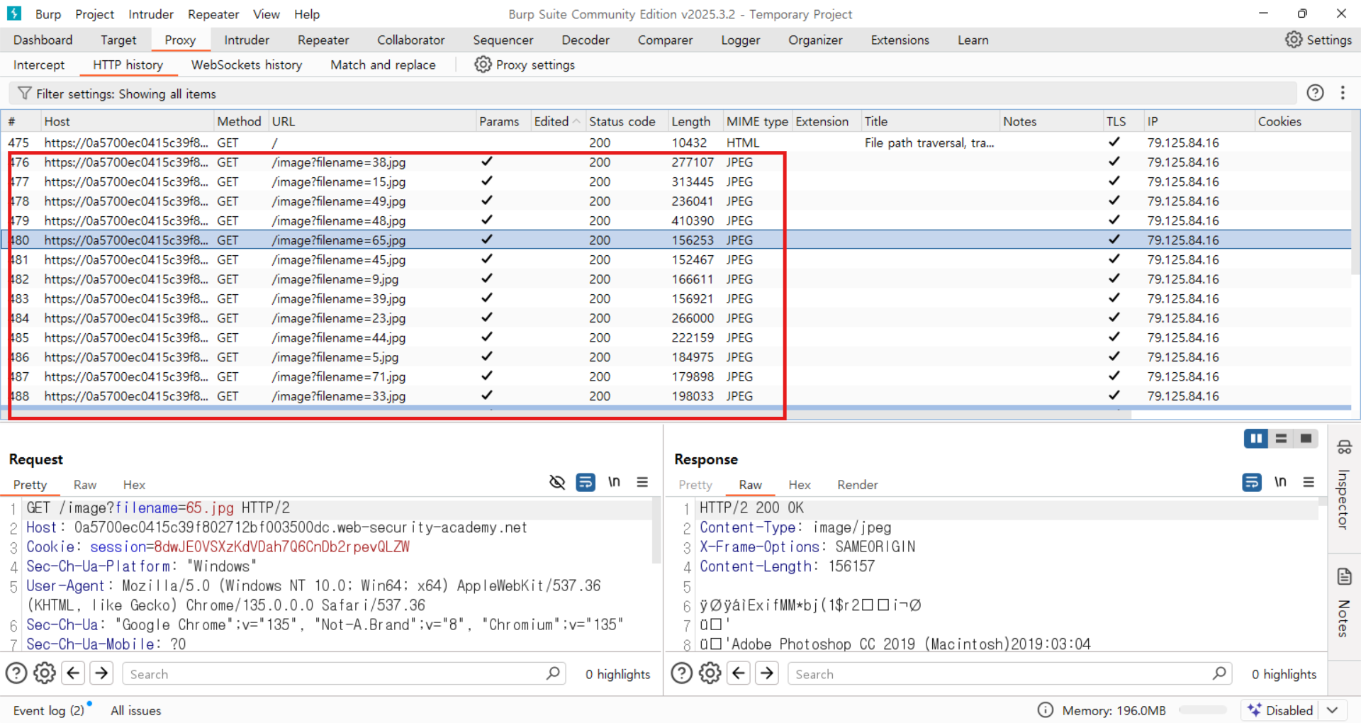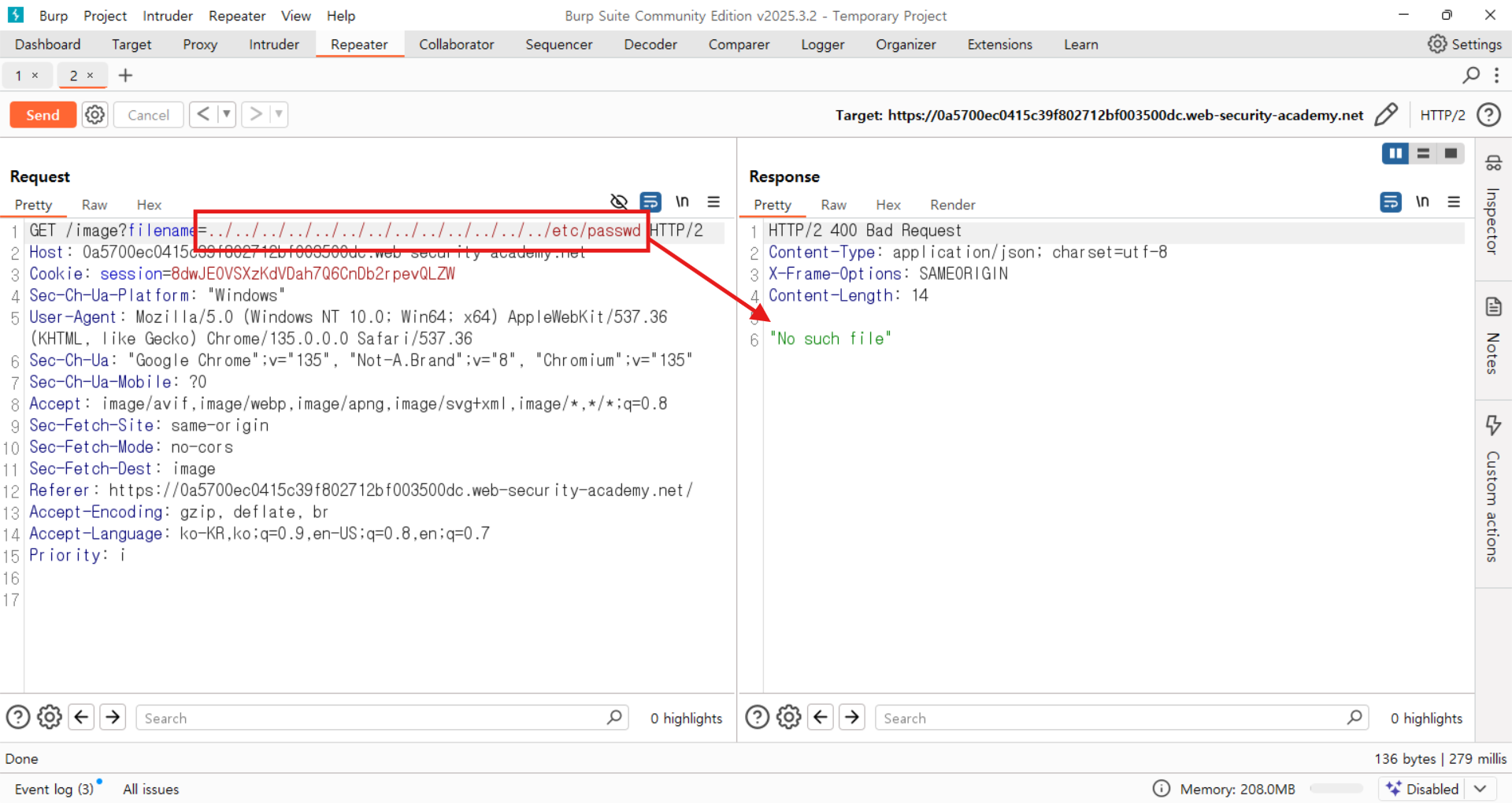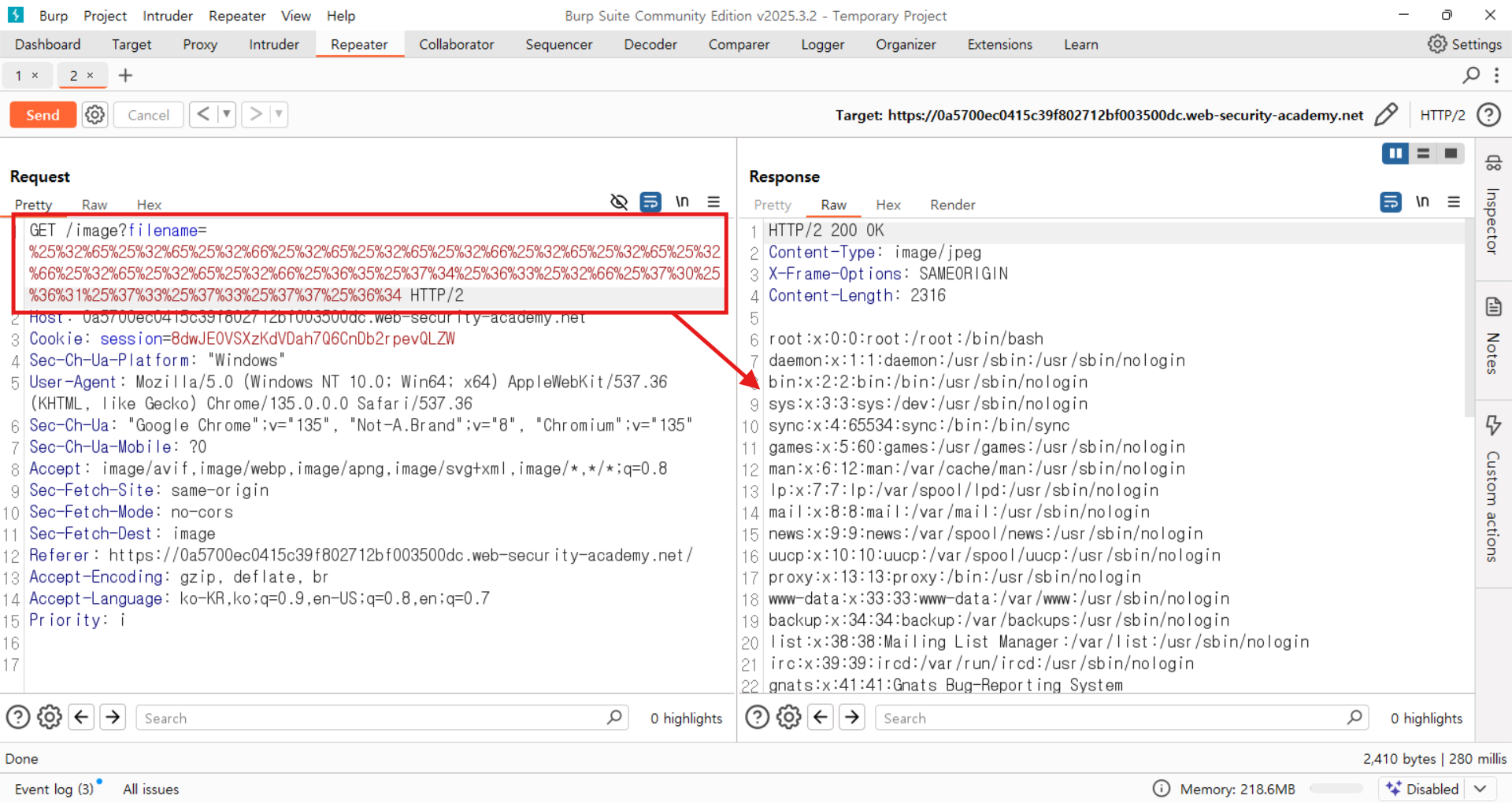 위에서 만든 이중 인코딩된 경로를 filename 파라미터에 넣고 요청을 보내면, 상태 코드 200과 함께 /etc/passwd 파일의 내용이 노출됩니다.