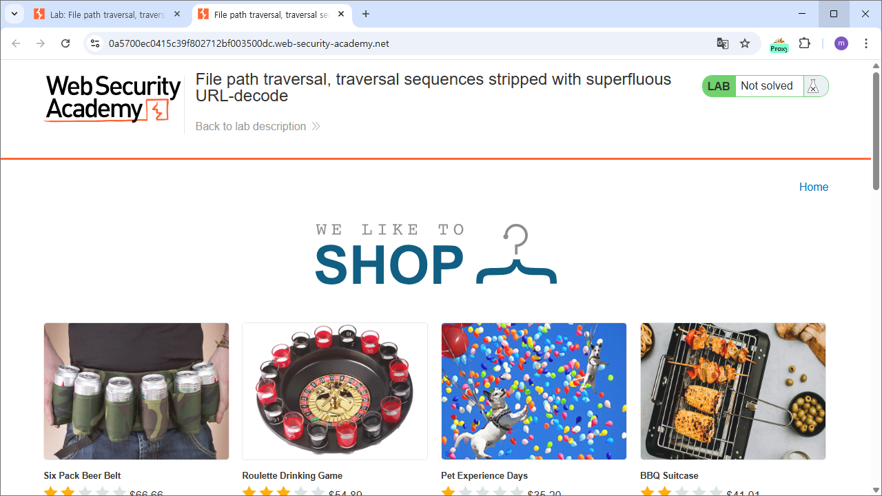 이번 랩은 상품 이미지 경로에 Path Traversal 취약점이 존재하는 웹 애플리케이션을 대상으로 합니다. 해당 애플리케이션은 입력값에 경로 순회 문자열이 포함되어 있을 경우 이를 필터링하지만, 이후에 한 차례 URL 디코딩이 수행된다는 특징이 있습니다. 이 점을 이용해 /etc/passwd 파일을 읽어내는 것이 목표입니다.